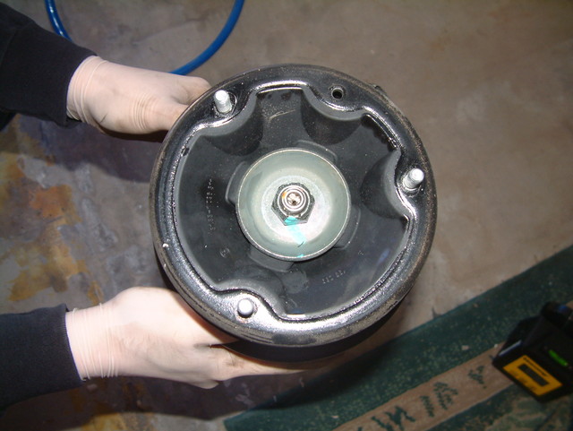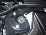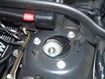 each strut tower is a round black plastic dust cap. Simply pop the dust