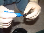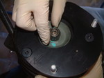 Pick up the resevoir and sit it on the engine valve cover as best you can without spilling it.