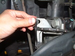 With a 10mm socket, remove the 2 black plastic nuts that hold the windshield washer resevoir on the strut tower.
