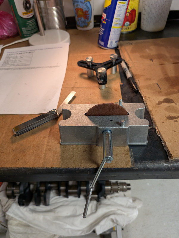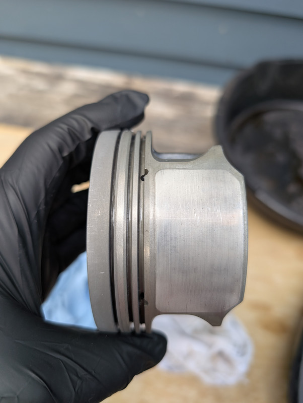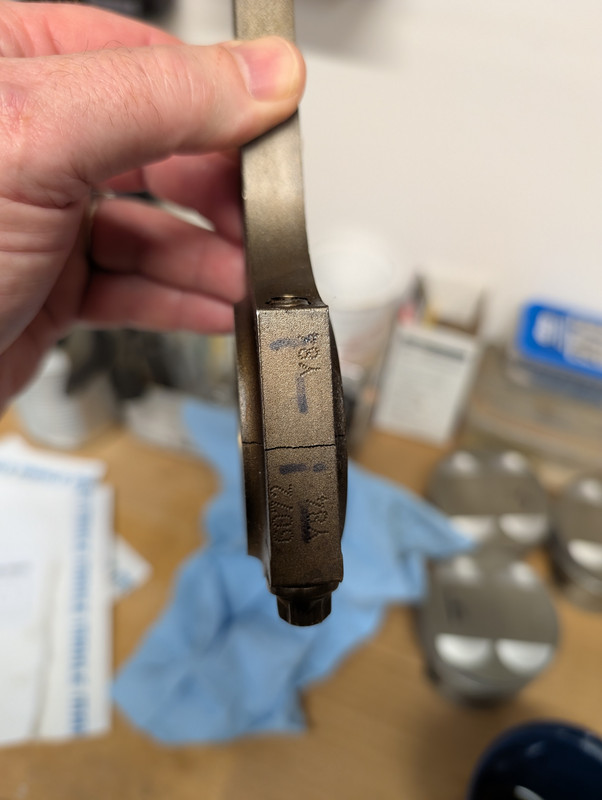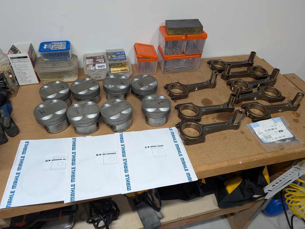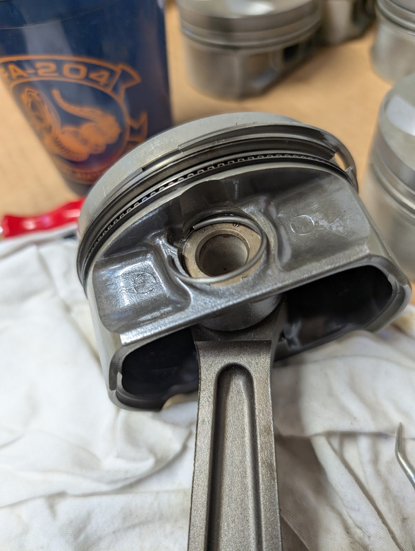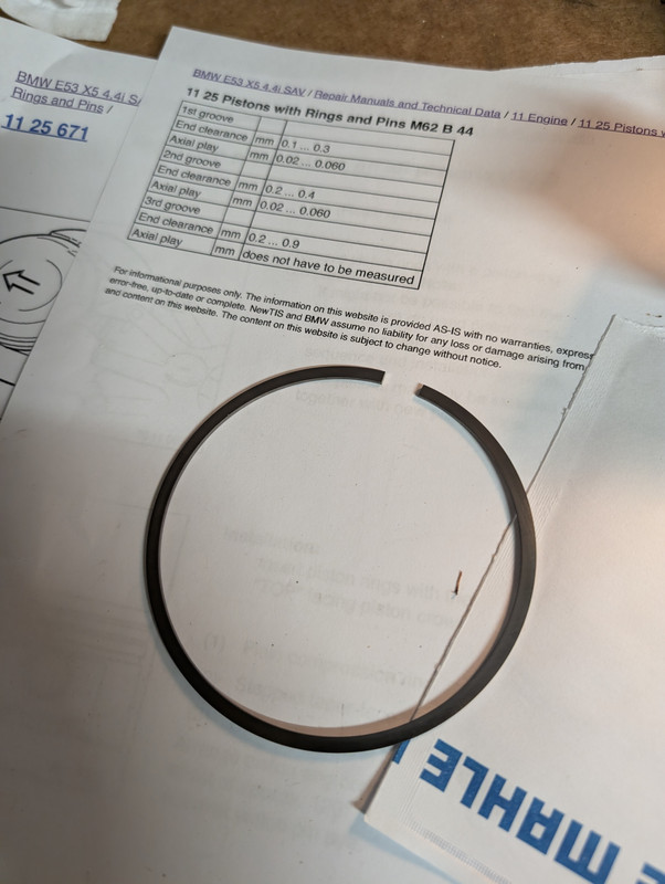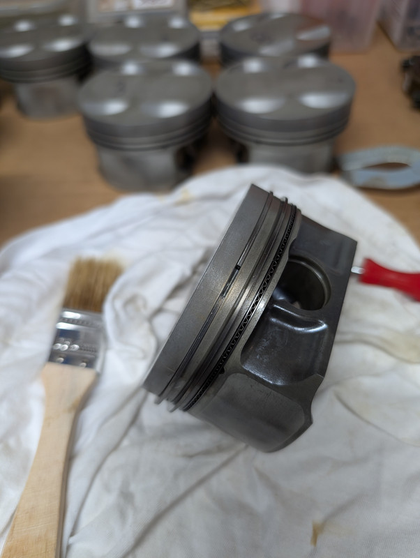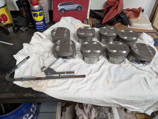 ![]() After spending some time with TIS, I organized all the parts I need to reassemble the pistons with new rings and pin retaining clips. ![]() The rings come from Mahle three to a box and each package happily tells you which ring it contains. The bottom oil scrapper ring is a three piece without a top or bottom, the middle ring has a profile and has “top” etched on it, and the topmost ring seems symmetrical, doesn’t have “top” etched on it but does have the Mahle symbol on one side, so that’s the side I put facing up. TIS calls for specific end and axial gaps on all 3, so I bought a cheap feeler gauge and ring tool on Amazon. ![]() First I labled the ring packages with the cylinder number they were destined for. Then after oiling the bore and ring lightly with motor oil, I placed worked it into the top of the bore and used the tool to press it down a precise amount. The idea is to not have it askew in the bore or the gap will be off. ![]() Then I would measure the gap with the feeler starting with the small end of the range given (ie .2mm) and then the largest. If the largest didn’t fit I knew we were within tolerance. I only found one on the tight side (within.05mm of the lower limit) so I used the other cheap Amazon tool I bought to sand a .05 mm off of it. It only took a few passes to get it to .2 mm. ![]() I checked the gap in all the rings, but probably didn't have to. One was a bit tight, but within spec, and all the others were well within spec. Thanks Mahle!. After measuring them all assembly was pretty straightforward. Oil the ring grooves with engine oil: ![]() install the rings, starting with the oil scraper (bottom) ring assembly, then the top two working bottom to top. A ring spreader was handy for the upper rings. I separated the oil scraper ring gaps by 10 orm15 degrees and will “clo ck” all the ring gaps 120 degrees when I install the pistons.TIS wasn’t too helpful at first with rod orientation, but after looking over some pics of the rod bottoms during disassembly, it did make sense. The rod bottoms have some numbers etched in them biased to the "front" (right side) of the rod. This allows you to match the forward side of the rod to the "forward" arrow on the top of the piston for assembly. Unlike the N62 rods, the M62 rods seem perfectly symmetrical at the bottom, but direction must matter somehow. Below you can see the “y84” on the right side of the rod bottom, which matches to the piston-top arrow facing right during assembly. I also put a sharpie arrow on each rod facing forward during disassembly, but had forgotten this. ![]() Pins, rod and piston bushings all got a light coat of oil and the pins slid in nicely. TIS emphasizes that no force should be used or needed to to get the wrist pins in. New snap rings went in to finish the assembly. ![]() Two done, six to go. ![]() I’ll pull the rod caps off when get to stuffing them in the block but I don’t want to risk mixing them up since each cap is "snapped" off the rod after the rod is manufactured. This creates a unique mating surface which doesn't allow for swapping caps and rods. Theoretically I’m also supposed to plastiguage the new version rod bearings using the old bolts, so I didn’t want to loose them.