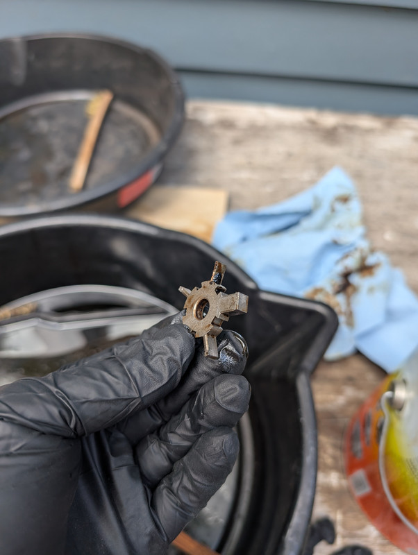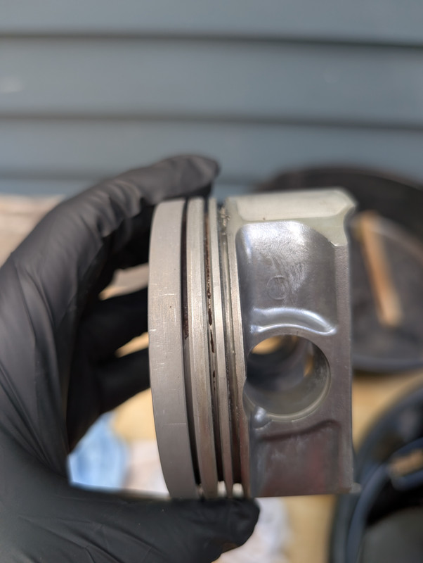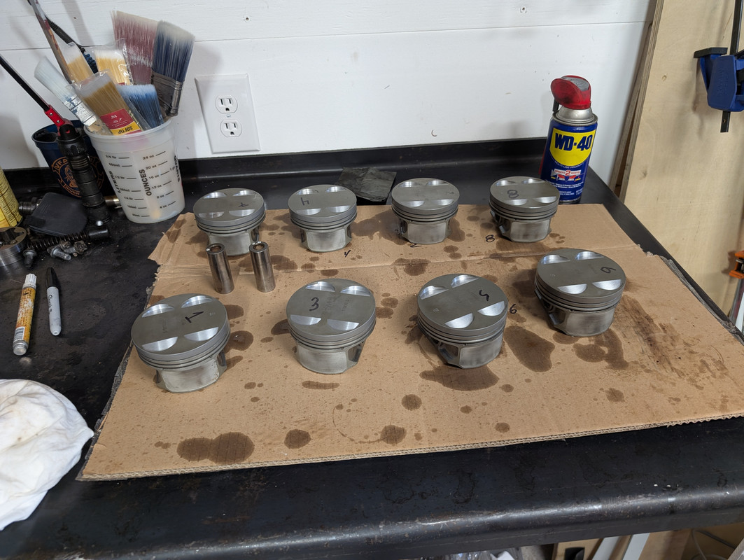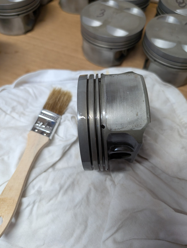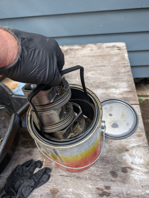 I picked up the pistons from the shop and the 1.5 mm extra they took out of each valve relief look great and should ensure the motor doesn't turn into shrapnel, at least from piston/valve interference. ![]() So I spent a few hours a day over the past 3 or 4 continuing to clean the carbon out of the piston ring groves. I had done an initial clean with Chem Dip before taking them to the machine shop, and I elected to stay with Chem Dip now, because I had it on hand and it cleans up very easily with water. No doubt it’s nasty stuff like diesel, carb cleaner, etc., but I didn’t need to use more nasty stuff to clean the pistons each time I dunked them. All told it took 3 baths in the nasty stuff for all of them, with a couple taking a 4th swim. 4 hrs is the single-dip limit for aluminum parts, according to the can and I would limit the pistons to an hour or two each time. Three at a time fit in the basket and I’d make note of the order number as they went in. The chem dip would strip the sharpie number on top and often the paint pen number I put on the inside too. what was left after the second dip: ![]() and after the last (usually 4th) dip: ![]() everyone in the pool: ![]() The cutting edge of the tool I bought for the job (because I wasn’t smart enough to hang on to an old ring) ![]() The tool was worthless when assembled, but the edge insert worked well after each dunk. Basically I’d put it in the groove with a bit of pressure and spin the piston against the beveled (cutting) edge on the tool insert. They are free of carbon finally, but in truth they look like old pistons. Some wear on the skirt coatings and occasional very light surface scratches. They are getting used regardless as new pistons seem like a silly expense for a motor that isn’t going to be anything earth shattering. I have got to think they will seal better now than they did at 150k, with all that carbon under the rings and on the tops. As mentioned, keeping them in order was a pain as the numbers dissolved in the chem dip, so I made sure to write down each time the order they were stacked in the can, and reapply a sharpie number on top as soon as the rinse water dried. There is a greater than zero chance that I mixed up pistons 8 and 6 though so we will see just how serious BMW is about keeping all the rods, pins and pistons together in their OE positions. ![]() a spray with WD40 to help drive out any excess water and they are ready for the new rings and to be reunited with the rods - maybe tomorrow after I remind myself of the particulars of the job in TIS.