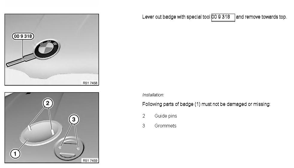 dont use that method to remove the front roundel, open the hood and push the two plastic parts that stick through, much easier and safer. you should probably replace the two plastic grommets ($1) that slip onto these plastic posts while your at it, trust me, dont risk your paint by prying. To install the new roundel, first put the grommets in the 2 holes push in all the way, then line up the guide pins and simply push it in. Let me know if u need more detail