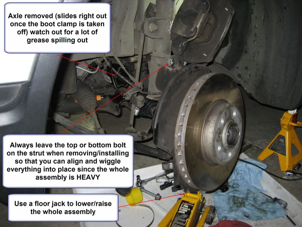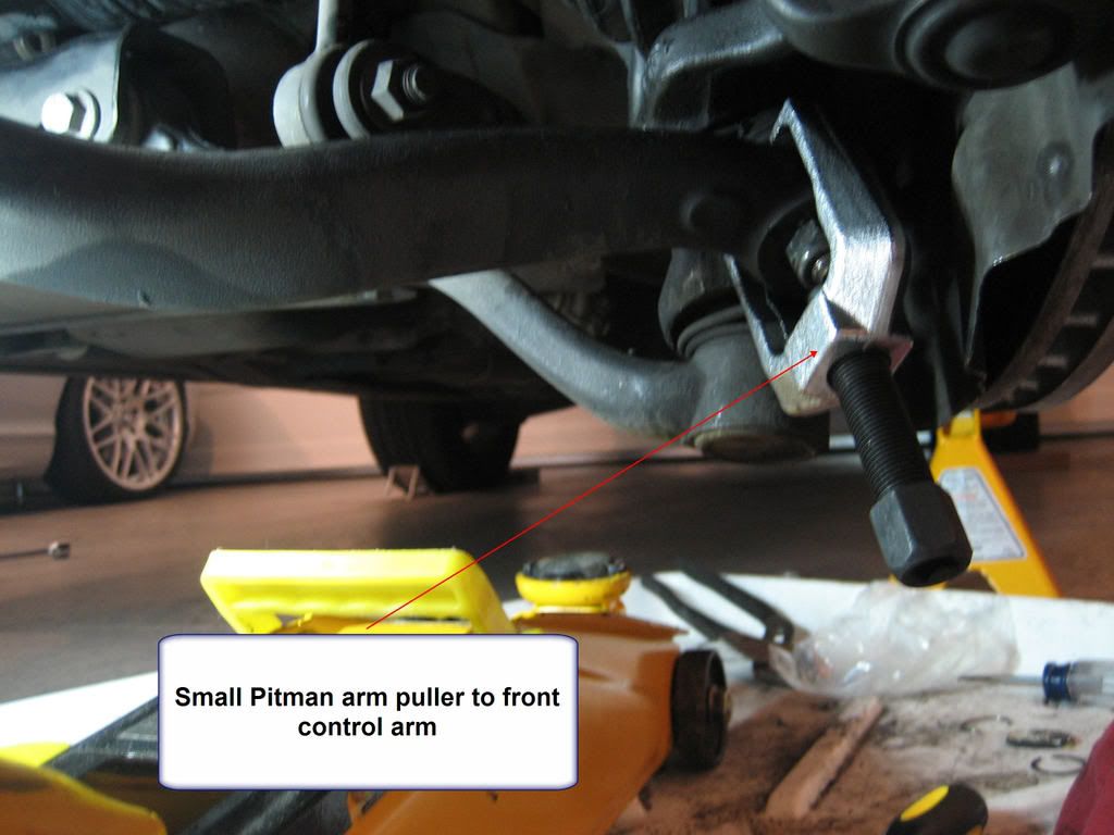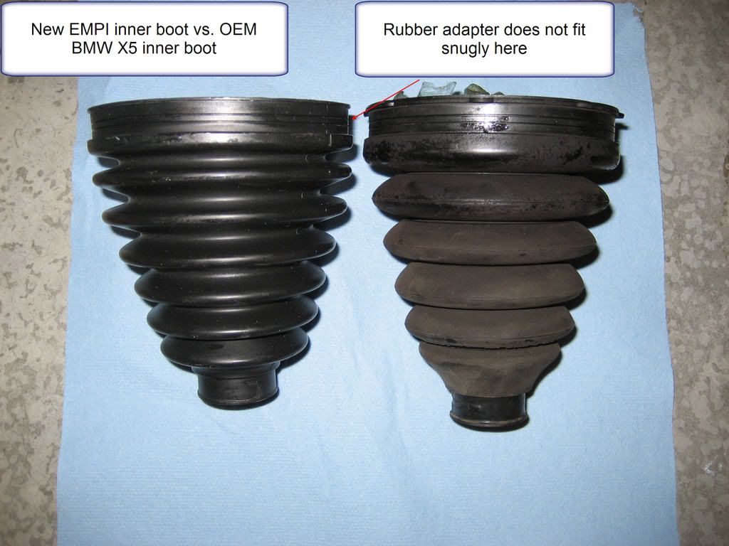 as well as to we350z and katit for their valuable info. Anyone who is considering this should read through the procedure in its entirety. we350z started the long-ass thread here which I found very informative since it included pictures of his disassembled hub following the shortcut by katit. It’s definitely much easier this way. I’m not going to get into the tools needed and torque values since everything is in the detailed DIY above. It’s not that hard, I’d say about 7 on a scale of 1-10 for the casual DIY person, however it is very dirty work and can be time consuming without the right tools. I would caution you if you’ve never worked on brakes/suspension, these are critical parts and now is not the time to learn, let a professional do it or a knowledgeable friend help with assembly due to the torque values. What you do to your car is your business so I am not responsible for what you do to your car. Do yourself a favor and devote a whole weekend to the project and do both axles at the same time. You’re going to do it eventually anyway. If one CV boot is leaking, the other boot is very close behind (mine is an 03 3.0 with 56K miles, garaged all its life when the boot started to leak) I inspected the other boot and it had very fine cracks in the inner part of the folds of the boot so it was ready to blow. It was also a lot less messy to work on the axle that did not spew grease everywhere. In addition to your regular metric sockets and wrenches (10mm-22MM) as well as allen wrenches, you WILL need the following: Boot kits with grease packs (make sure to use the correct grease) New rear control arm bolts (they are torque to yield) Pitman arm puller (2 sizes) $26 for both at my local cheap parts store CV joint boot clamp plier $9 Snap ring pliers (if using the EMPI inner boot kit) 2 rolls of blue shop towels (you’ll need both if your boot is already leaking) 1 box of latex gloves (100 ct.) Harbor Freight has them cheap Zip ties (heavy duty) a thick wire coat hanger may work too Small floor jack to raise/lower the hub assembly Here are the most critical tools: ![]() Removal: Chock the rear tires, jack up front and secure with jack stands, remove both front tires/wheels so that you can use the opposite side for reference, bolt orientation, etc. I left the key in the ignition so that I could turn the steering wheel right/left. Remove the ABS brake sensor with an allen wrench, then remove the two 16mm bolts holding the brake caliper to the hub. Slide the caliper off the rotor and zip tie it to the strut. It’s heavy so secure it well or else it could fall and damage your brake line (see pic below) ![]() Below is a picture of everything you have to remove in order to pull off the hub assembly. I pulled off the whole thing including the brake rotor since I couldn’t remove the motherf&^%$#@! allen screw holding it on which made it HEAVY. ***Leave the top bolt holding it to the strut for last so that you can disconnect the axle and all the bolts/nuts without the whole assembly falling on your foot. Remove 16/18mm bolt & nut combo for the rear control arm (see pic below) ![]() Remove 22mm nut from the front control arm using the small pitman arm puller (see pic below) ![]() Remove 22mm nut from the tie-rod using the large pitman arm puller. Turn steering wheel all the way to the right (when working on the LF wheel) so that you can get it on (see pic below) ![]() Remove the large CV boot clamp from the inner boot, don’t re-use. Once this is removed, the axle will slide out and grease will spill out (see pic below) ![]() Here is another pic with the grease cleaned out. ![]() Once everything is off, put a small floor jack underneath the hub assembly then take off the large bolt and lower it gently. I laid mine on some rags on the floor to protect the brake rotor with the axle sticking straight up so that I could work on it (see pic below) ![]() Clean the whole axle shaft so that when you slide the boots off/on, you don’t contaminate anything with dirt. This is the time to remove the remaining CV boot clamps on inner and outer boots. Clean up all the grease from the inboard side, remove the retaining clip and hammer out the 3-sided bearing assembly from the shaft (see pic below) ![]() Remove inner and outer CV boots. Remove the rubber adapter from the old inner CV boot to be re-used if your kit did not come with one (my EMPI kit did not come with this adapter) Clean up outer CV joint, I just wiped off as much of the excess grease as I could since mine was not contaminated and then added the grease supplied with the kit. Apparently you are supposed to use non-petroleum based cleaners (these can leave a residue) Install new outer and inner CV boots as well as the clamps (leave the large inner clamp for last) I also noticed that the inner joint used a yellowish lithium grease so I did not use the supplied dark gray grease pack from EMPI and instead bought some Coastal brand lithium grease from Autozone. It’s not a good idea to mix different kinds of grease since they react with each other. The EMPI outer boot kit from Autohausaz fit perfectly. The inner boot kit however did not come with a rubber adapter and the OEM BMW adapter did not fit very well. I used it anyway and just hope that it does not come off, I recommend using a new OEM inner boot. I would not recommend the EMPI replacement boot (see pics below) ![]() ![]() ![]() Once inner and outer boots are on and clamped, install the 3-sided bearing assembly. One side is tapered for easy install and alignment to the spline so make note of this when hammering it back on (do this gently and avoid hitting the bearings) Install a new snap ring (provided in the boot kit) and then the rubber adapter. Put a ziplock bag around it to keep it clean during assembly. Assembly: Lift the hub assembly onto your floor jack and raise it so that you can put the top (or bottom) large bolt to hold it temporarily to the strut. You can still wiggle it 