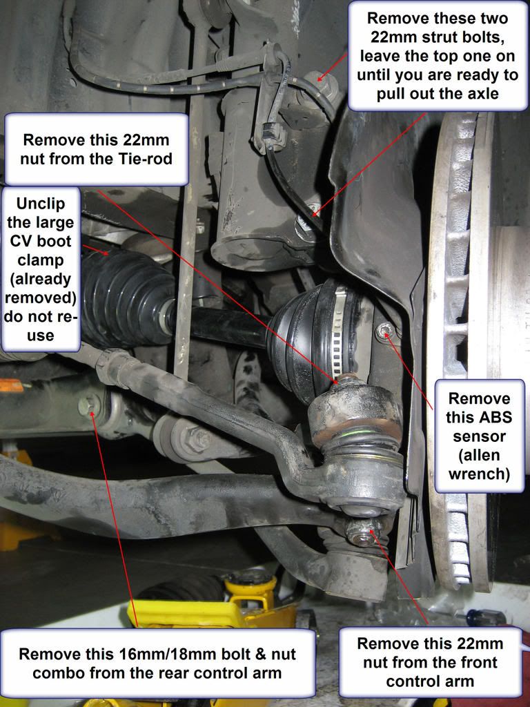 i`m tryng to figure how to do this so i`ll try to describe what i`ll attempt remove wheel remove collar nut remove control arm nut and bolt at subframe , let arm hang do not remove brake caliper or tension strut or steering rod end do i need to turn steering to allow me to hammer out axle shaft from hub do i need to remove speed sensor before hammering axle shaft |