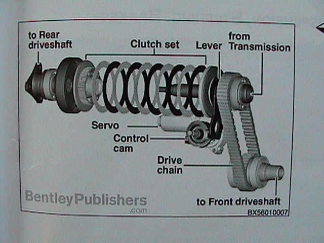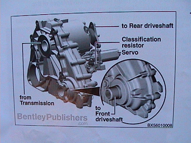 From the engine, following the powertrain, there is a transmission, then a transfer case, then two differentials. The transfer case may be an early model (up to 2003) or the later model (2004 onwards). The later one is the x-drive model, and it has clutches in it to control slip. It uses a different oil than the early transfer case.