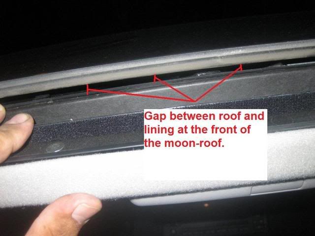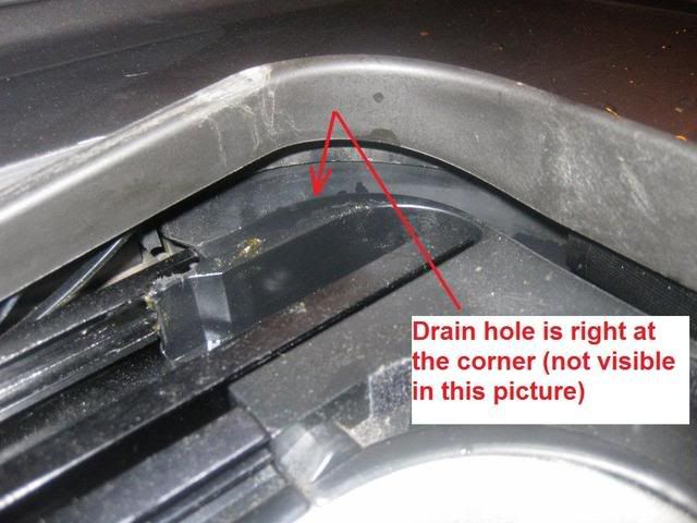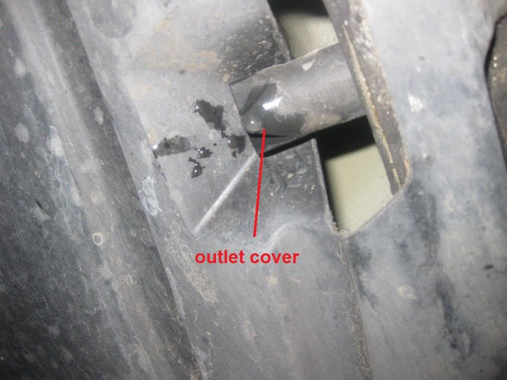 But upon examining the front of the moon-roof, I noticed that there is (what I would consider to be a large) gap between the roof top and the roof lining on the front side. I used a flashlight and I could see through it the inside of the top console, including the moonroof switch and connector to it. The gap is about 1/8" to 1/4" all the way across, with no weather stripping or anything stopping water from getting in. So if there was any leak from moonroof, it could find its way through this gap into the top console before it finds its way down the drain. I think I should be able to open the top console and seal the gap in that area with some sort of duct tape or some other sealing material from inside (suggestions welcome.) Even may be put a piece of foam there to absorb the little water that finds its way in through there. killcrap, is that were the foam is being placed as a workaround? Here is the picture of the gap: ![]() Here are some pictures for those who are interested: Here is the drain comes out under the car: ![]() On the front-passenger side: ![]() The outlet is covered by a rubber piece that has cuts at the end to open as needed: ![]() On top, the front drain holes are at both corners, its general locations is shown here but the hole itself is not visible in this picture (couldn't find an angle to take a picture of the hole... but you can't miss it when looking in that area)