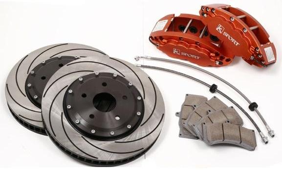 Well I was looking into a BBK and didn't want to spend that much $ on brembo but I found something else and figured I try them out. Ksport Procomp Front Big Brake Kit (14 in. Rotor 8 Piston Caliper) 8 Piston Aluminum calipers D.O.T. Compliant Stainless steel brake lines Machined aluminum hats Carbon steel brackets Minimum Required Wheel Size 356mm (14") large ventilated discs (18" wheels required) High quality Ksport SC5 street brake pads It comes in two color choices - Anodized Black & Orange. I got the orange to match the orange reflection in the corner of the headlight! Well in 3-4 weeks I should have this kit I can't wait to install them. So I can't really comment on them until further notice.