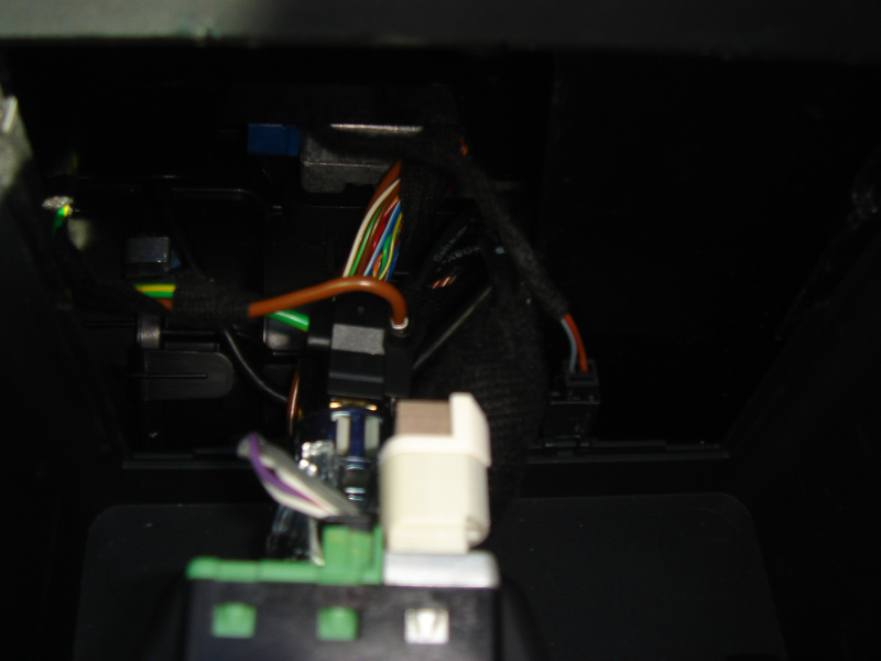 3) The AUX input connector (maybe USB on yours) and power receptacle are mounted on a plate at the front of the storage compartment. Use a small flat blade screwdriver ( or something similar) to pry this out gently from the top. With a little force, is should snap out. I snaps back in easily. With this removed, you should be able to find the harness connector for the eject box. It seems to be held lightly in place by a clamp of some sort, but I was able to pull it out with very little force. This is clear and I have the AUX input (iPod) connector.