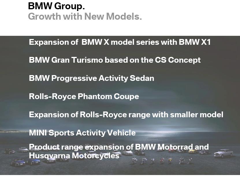 ![]() Here's explanation of slide: X1, Gran Turismo, MINI SAV, Rolls-Royce Coupe to be launched by 2012 The BMW Group will continue its product initiative, making use of modular systems for all new models in order to increase synergy effects. A new X1 model will complement the successful X Sports Activity Vehicle lineup, in addition to the BMW Concept X6 presented at the Frankfurt Motor Show. Furthermore, the company will manufacture a four-dour Gran Turismo based on the CS concept study showcased in Shanghai. Another result of the new strategy is that the BMW Group will not build a space-functional concept. Instead, the company plans to introduce a fundamentally altered concept called Progressive Activity Sedan (PAS). This concept will establish an entirely new segment, introducing a unique interpretation of the sedan and offering a wide range of intelligent features. The next MINI model will be a Sports Activity Vehicle. The Rolls-Royce model portfolio will be expanded as well: A Coupe will be launched as the third variant of the Phantom. An additional Rolls-Royce model is in the pipeline; it will be positioned below the Rolls-Royce Phantom in terms of both price and size. Furthermore, the BMW Group will continue to extend the product portfolios under the BMW Motorrad and Husqvarna Motorcycles brands in the years to come. Last edited by LeMansX5; 09-28-2007 at 10:53 PM. |