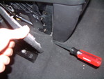 The carpet trim panel on the center console just pulls out. You may have to pry with the flat blade screw driver.