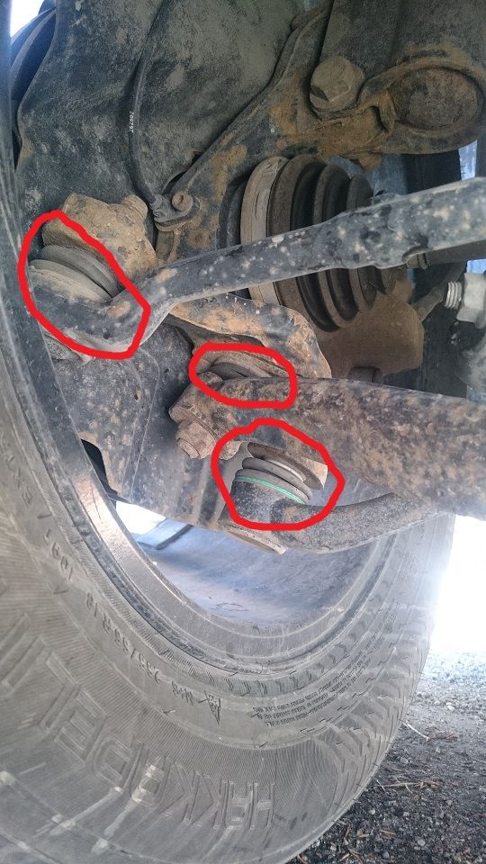 Hey guys, So I noticed my Front Sway Bar End links are worn so I ordered parts for those separately and they are on their way. I then noticed that there are several bushings in the front suspension/control arm area of my X (3 per side) that also look like they could use replacing. I need some help identifying which bushing/part is which so I can price whether it is cheaper/easier to replace the entire part with the bushings already installed, or to just replace the bushings themselves. I believe the left circle in this picture indicates the Front Lower Control Arm Tension Struts. The middle circle indicates the Front Lower Control Arm and the right circle indicates ....something. I can't seem to find what everything is and it's my best guess.  1) How bad would you rate the condition of my bushings/joints shown above?2)Would this kit from ECSTuning, solve all my problems to get all these bushings replaced? BMW E53 X5 N62 4.4L - 31126769717K - Front control arm Refresh Kit - ES#2771547 minus the sway bar end links that i've already ordered   |