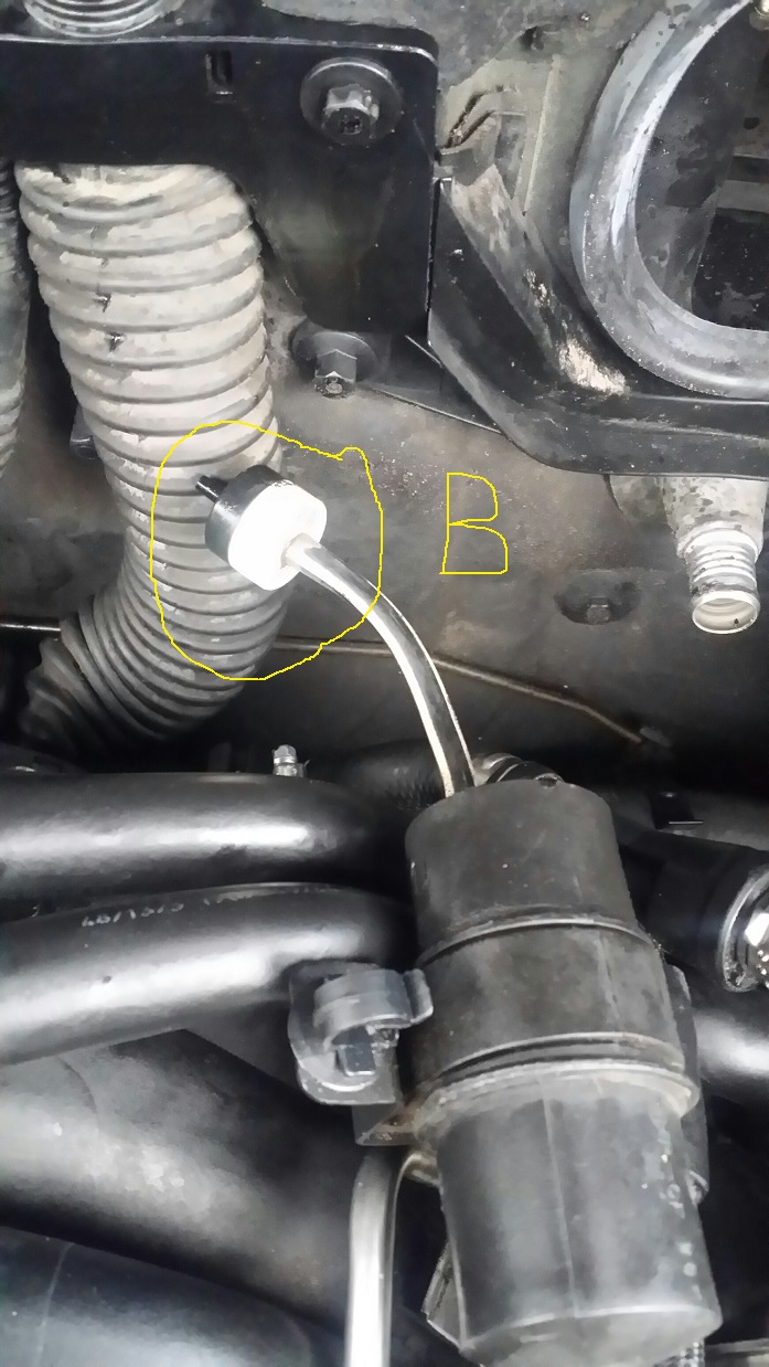 A: Plugs into B. You will need a piece of vacuum hose to connect (B) to (A). BTW, that black plastic canister in the photo for (B) is in the wrong place. It mounts further forward. C: Off the top of my head, I believe that goes to a fitting that sits on top of Bank 1. If you can't figure it out, let me know. I'm going to be pulling the plastic engine cover off my 4.6 later today and can take a photo.