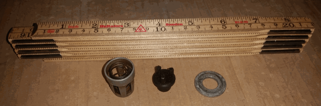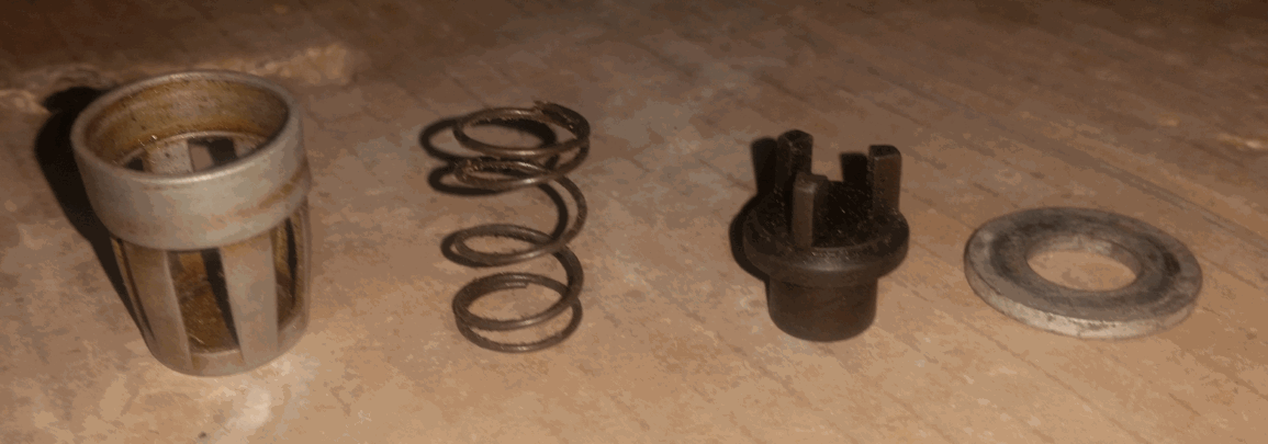 Pic1. All the parts separated. The item furthest to the left came out flying first followed by the spring and the plastic bit....the washer I found on the ground after trying to see if I got all that fell out and to be honest I'm doubting it even belongs there now. ![]() Pic 2 & 3: I am guessing here that the spring goes inside the housing and the plastic but on top (flat end inside the spring), this way when pressing on the plastic bit the spring will compress. Pic 4 & 5: Different ways of positioning the washer. I don't think either of them are correct. Especially the fifth pic, that way the spring cannot be compressed by the plastic piece. Pic 6: Just showing how the plastic piece fits inside the spring. There is no other place that plastic piece goes...i tried inserting it into the housing but the mid diameter is too big on the plastic bit. I can't separate the images and add text between them like you do....sorry about that. Let me know what you think.