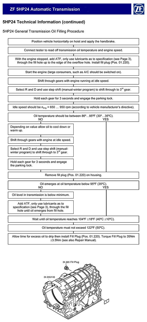 Well spotted :-) I have introduced 2 litres of clean oil into the system but still no oil from filler plug even at 50 deg C. The gear shifts are perfect and all error codes have gone. Oil was overflowing at 35 deg C with the engine off but nothing with the engine running and the tranmission in park. It just shows that you have to follow the oil level check procedure to the letter. With regard to the faults I can only assume that the low oil level was causing the pump to suck air. This condition was worse under heavy acceleration or on a hill start or when turning out of a junction where the sump oil was forced either to the rear or the side of the sump. As soon as air reached the pump the pressure would drop in which ever circuit was active causing immediate release of that gear followed by lots of software alarms. It all makes perfect sense. I will top off the system when more oil arrives. In the meantime I just have to diagnose where the fluid is escaping from. The box itself is dry with no obvious sign of leakage however the alluminium plate under the engine is wet with fresh oil with the occasional drip from the anti-rolll bar. My bet is the front seal unless there is a leak in the cooler circuit. I will report back after further investigation. Well done again RRPhil for a spot on diagnosis from the described symptoms. Thanks from a very relieved X5 newbie Stuart