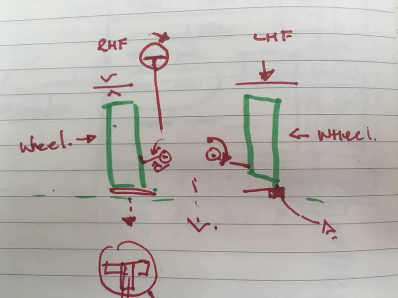 Please find attached my awful diagram, you can see that I have a force creating a larger contact patch outside of the tyre on the road the steering will then pull in that direction. That is my thinking?