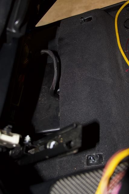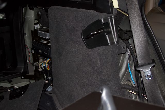 I chose to use the same route to the rear as I did when I installed the Mediabridge. I went down the driver's side behind the console side trim. I lifted the carpet at the seam under the driver's seat and routed the cable to the side trim under the door. I removed the trim pieces under the front and rear doors and slide the cable under the carpet. I pulled the bottom out of the plastic trim between the front and rear doors to get the cable under the carpet around the door post. The only upholstery piece I removed to do the install was the small piece on the driver's upright portion of the rear seat, from there it is easy access to the rear.