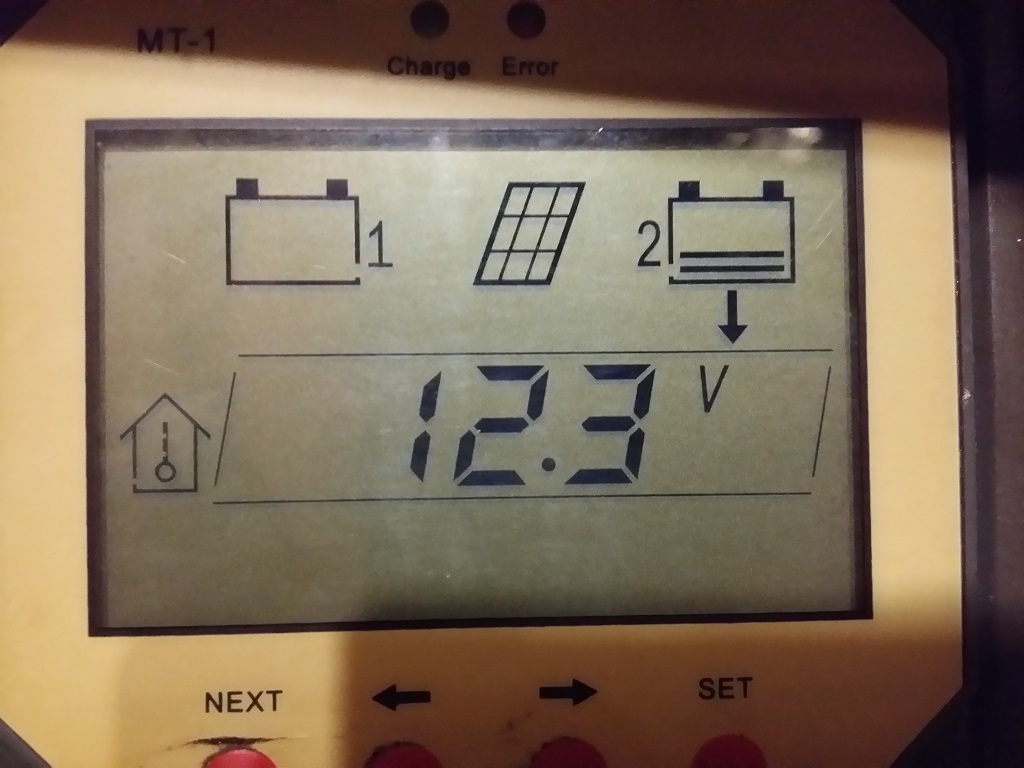 This is one of the many meters I have mounted to the underside of the shelf on my computer desk. Each meter can show 2 of the batteries on the solar setup. This one is showing the voltage of my X5 for instance. So if the battery has issues I can see it from in the house. Notice it shows 12.3 it should be showing about 12.5 or higher. The battery is dying in my X5. Tomorrow will be the first full day of charging by the solar panels so I will see what they can do to recharge it to max. But I don't have much faith in it. If nothing else this will insure I can keep driving it till I can get around to changing the battery.