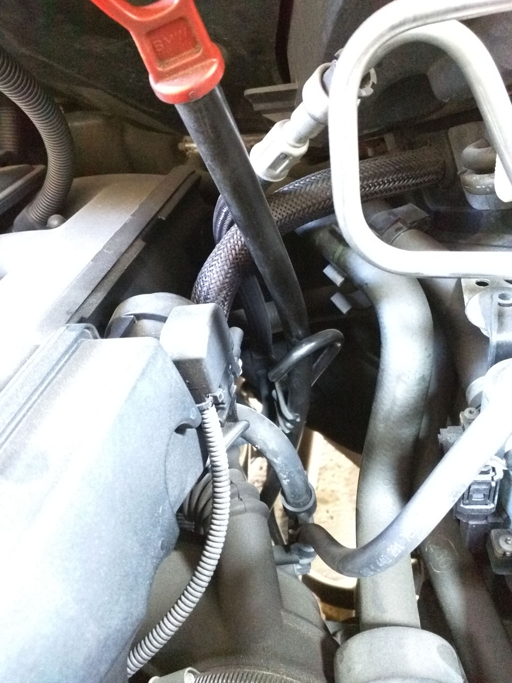 Can you identify this small vacuum type hose on my 2003 E53 X5. It is just below the top of the oil dipstick tube. I cannot tell if this is a vent, if something is missing, if it is disconnected, etc. It is the hose that curves over like a candy cane.
