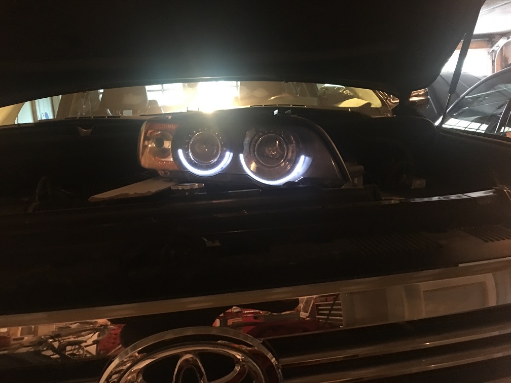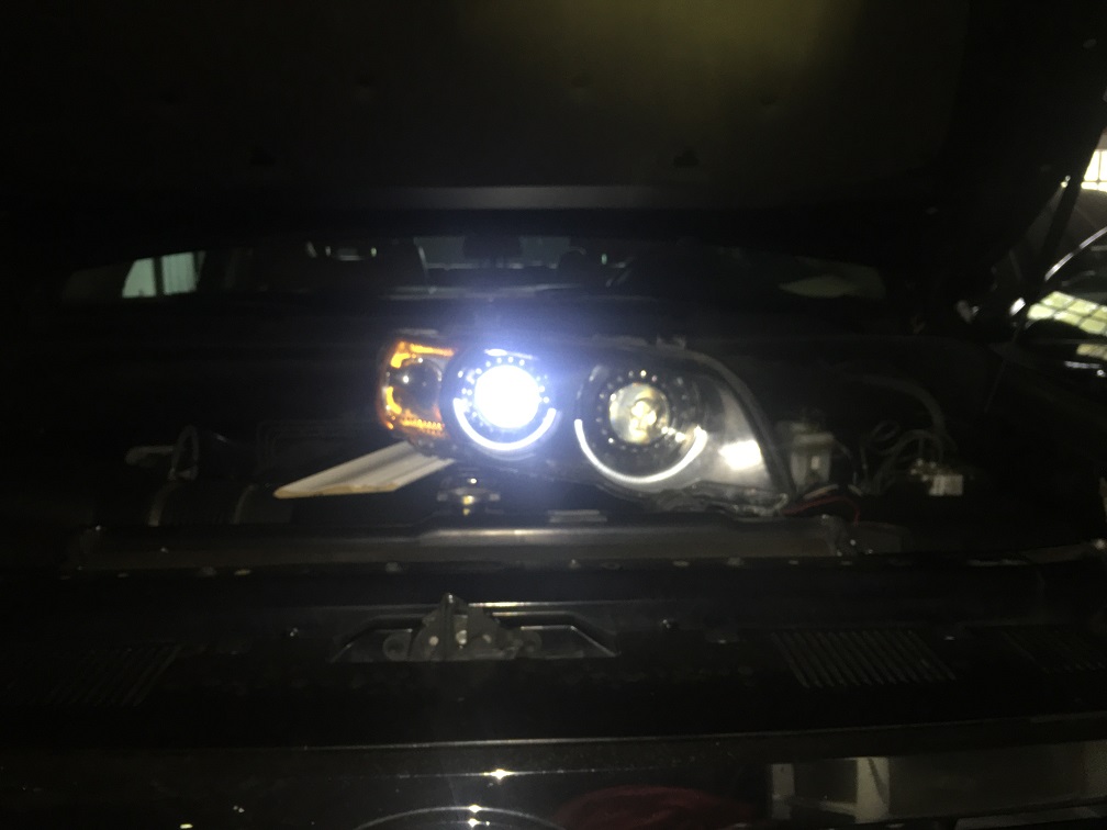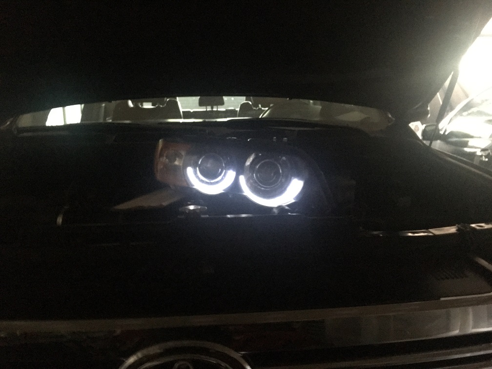 Here are a few pics I took powering the e53 headlight mod I did yesterday. Power to the rings from my Tundra battery. The last pic is not with the xenon on, just reflection of the flash. Sorry about terrible pictures but I think it shows where I'm going.