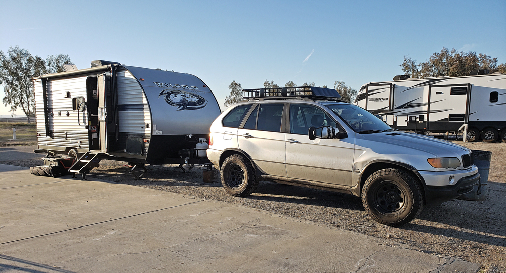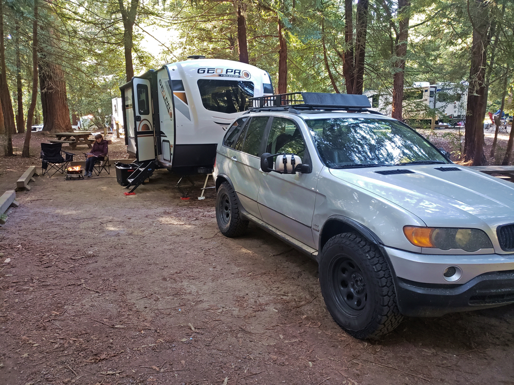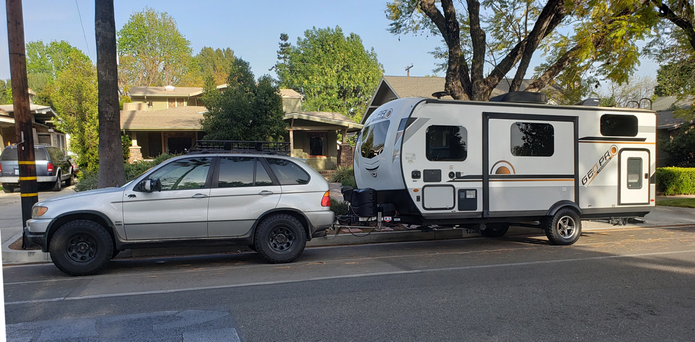 The E53 3.0L X5 is a very comfortable tow vehicle with a nice ride, good ergonomics, and a great (aftermarket) stereo! The miles pass by easily. Overall, I really enjoy towing with the X5 and already have five more towing trips planned this year. I have found trailer camping to be incredibly convenient and fun.