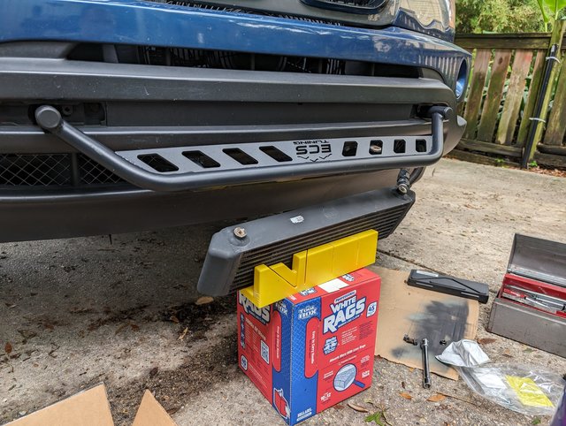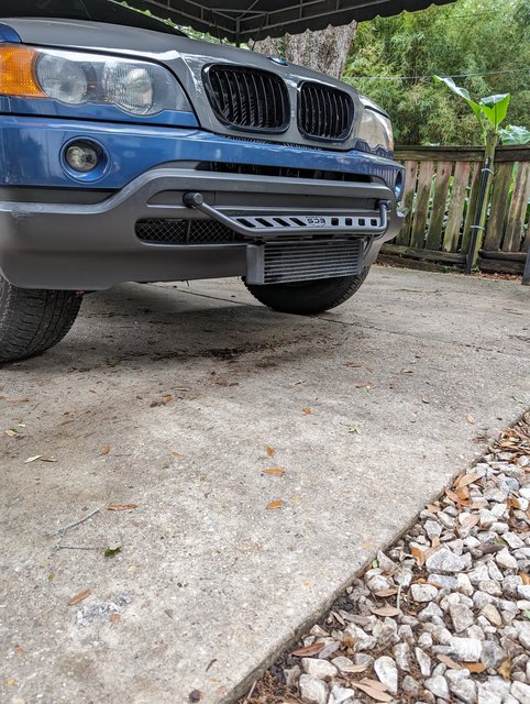 Still avoiding the CV boot job, so I takled another, more cosmetic job today on the X5. My CSF oil cooler was mounted on a bracket a friend made for me, and screwed into the front bumper in two spots where the bumper cover bolts into the metal bumper. Not the strongest set-up, and no protection for the cooler. So I was happy to see that after 22 years, ECS Tuning is making some overland-oriented parts for the E53, including a light bar. So I grabbed one with the thought of using it for a better cooler mount, and a place to put some KC driving lights.