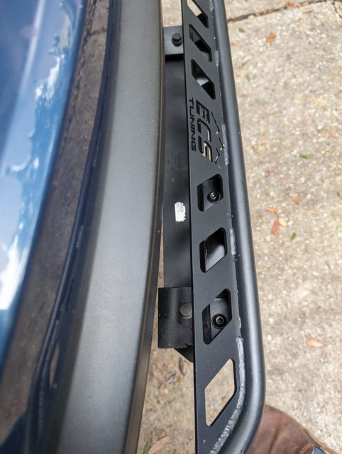 I elected to install it upside down as this position made for a better cooler mounting position, and offers some protection for the cooler. The CSF cooler is exceptionally heavy duty, and has survived one "gentle" rear-end accident, courtesy of my daughter, but I'd like a bit more. The bar simply bolts into the tow hook points and is 1" powder coated steel tubing. They make a tow hook that I've got on order which is longer and will engage the thread, and hold the bar on. ![]() I cut some simple brackets from 3/16th steel and measured/drilled the hole to mount the brackets to the pre-drilled light attach brackets on the ECS Tuning bar, and mount the cooler to my home made brackets. ![]() After that it was just a matter of bolting it up with some black stainless fasteners, cutting holes in the tow point covers and putting it all together. ![]() ![]() Much more secure solution that I'm pretty happy with. I've got some light clamps to pop on and some 4" KC classic Halogen driving lights to install and wire up when then arrive. ECS is making a switch set-up for the ash tray which I will use, and modify two of the positions for the USB plugs I've got snaked into the ash tray from my Kenwood head unit currently.