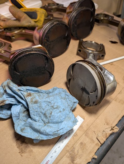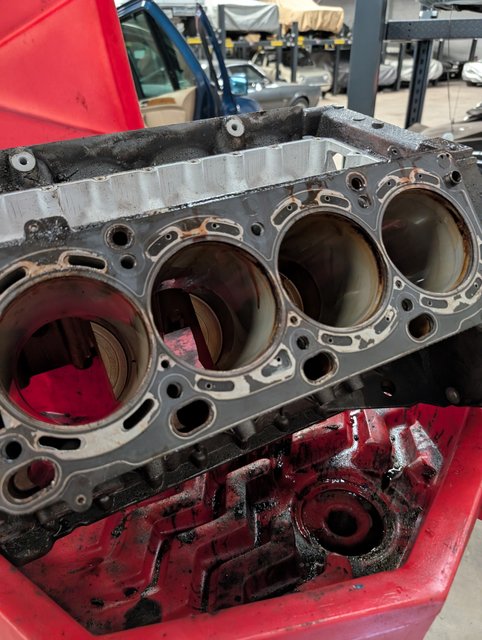 First thing was to label the main caps, rod caps and pistons with a sharpie, which will probably come off while cleaning, but I keep forgetting to get a dye pen. At least I won’t get confused as I pull all the parts out. The tops of the pistons have arrows point towards the fronts and the rods and caps are etched with identical info so matching them back up is tough to screw up. Interesting fact I learned from JimLev over on BimmerForums: the connecting rods and caps are cast as a single piece, and then the caps are broken off the connecting rods, so they really shouldn’t be mixed up. I also noted the paint dot colors on the crank at each main bearing journal, as these colors help determine the cap side bearing shells to use. Interestingly, I had dots at 4 of 5 journal locations, but not the rearmost journal. No dot. ![]() Once labeled and lots of pics taken, all the caps came off, both from the rods and main bearings. The pistons are easily pushed and then gently tapped out of the top of the block, taking care to be ready to catch them so they don’t land on the floor. One note: pull the oil squirters first as I nicked one with a rod on its way out. These little things are stupidly expensive, so hopefully mine isn’t ruined. I’ll clean them all up and see how it looks. Once the pistons are out, or at least pushed to the tops of the cylinders, the crank lifts right out. ![]() The thrust bearings on journal 5 keep the fore/aft play within specs and drop out, literally, when the crank is pulled up. I think I’ll likely buy new ones as they seem really important, and mine have 150k miles on them. They come as an upper set (2) and lower set (2), and are cheap. BMW called them “upper guide washers” and they are keyed to fit into the number 5 main bearing cap. I drained the remains oil from the block and took a better look at it. Time, and a micrometer will tell, but there is no scoring in any of the cylinders, which is a great start. ![]() It all got loaded into the X5 (ironically), and I dropped the block and oil pan off at the machine shop for a good cleaning and to measure the bores, both for diameter and roundness. 93mm is the magic number, but there is a tolerance for that, and for out of roundness. The oil pan is likely scrap, but I want to hang onto it just in case it works better in the e34 or e36 the motor finds a home in. It’s a long shot because it’s so deep, but my quick take is that the lower sump is located significantly farther back on the x5 than on the 540 (rear wheel drive oil pan. Who knows, it may help clearing a front crossmember, if it can be modified to be more shallow. ![]() The crank and pistons came home to my little shop and the pistons will need a serious cleaning. The crank looks great, and my initial measurements of the journals look spot on, where TIS, says they should be. This is added peace of mind to my earlier adventures with plastiguage, which also showed journal 1 to be exactly within new spec. ![]() Next I’ll clean and measure the pistons, and start ordering rings and upper bearings shells for the connecting rods (I have new lower shells already), and rod bearing shells.