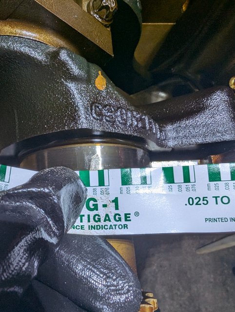 It makes sense too, as you conclude, that the stages are for reworked crankshafts. Mine has never had been reworked which would explain why there is no "tic" mark(s) punched or etched into the number one bearing balance lobe. They must lay another mark down every time the crank gets machined to fix damage or wear. The rod bearings are pretty straight forward: red on one side, blue on the other. There are different sizes, but I'm hopeful that I don't have to buy 16 new shells. All my main bearing shells had the top layers worn thru, but without knowing how they are made, I can't say if this layer is a sacrificial one, or a bearing layer. So I'm going to just replace all 10 of them. They are cheaper than the rod bearings thankfully.