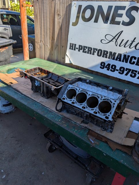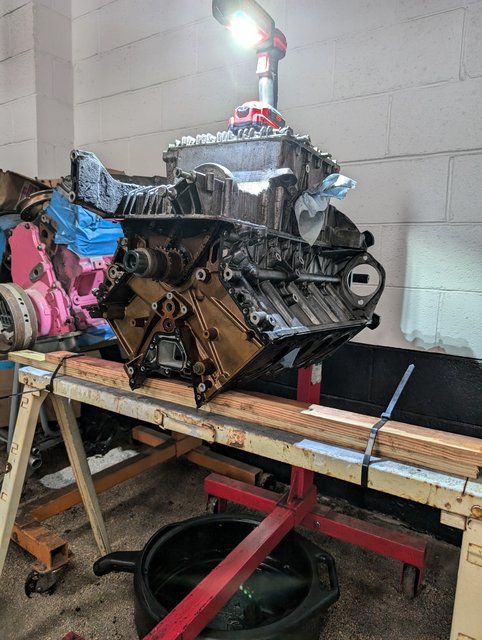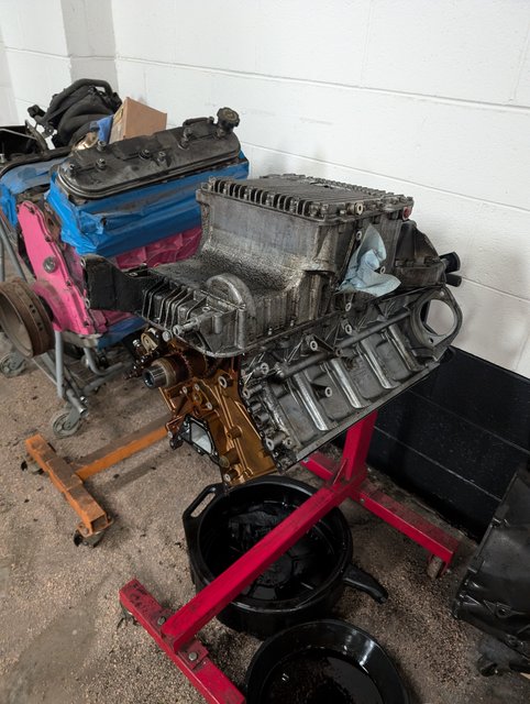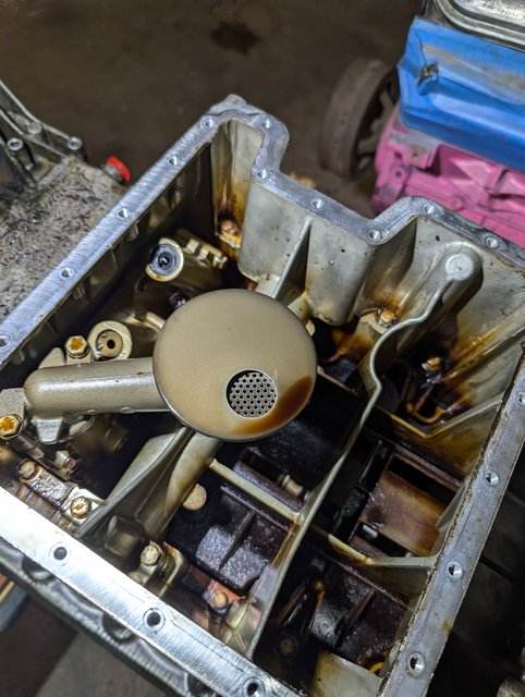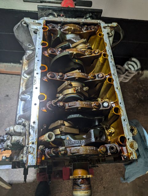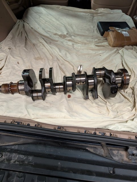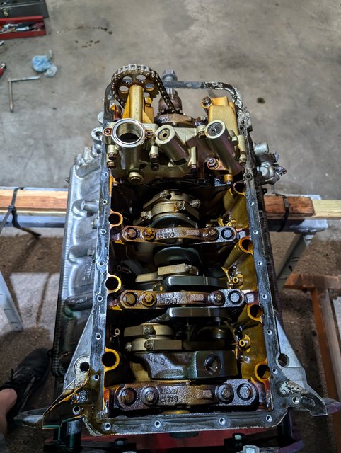 ![]() After the 732 internal and external oil pan bolts came out, the pan lifted off easily. The lower pan cover showed a lot of nasty mud, which I guess is just the end result of 24 years of accumulated crap, including macerated guide rail plastic. No chunks however and the pump looks pristine. The rear bearing seal carrier/plate also has a lot of this crap baked onto it, but the block looks really, really good to my eye. ![]() ![]() The pump internals looked very clean, or at least as much of them as I could see when I pulled the pickup off and unbolted the pump itself: ![]() The block itself and the crank look very clean, and I rotated the motor to look, as best I could at the bottom of each cylinder, especially on the piston skirt sides where it seems bore score tends to happen. Tough to see every inch of the bores with the rods and crank in the way, but what I did see looked good thankfully. ![]() Next job was to pull the bearing caps, one at a time for a quick look. The bearings looked worn but the crank journals look like they are in excellent shape with no scoring or other signs of visible damage or wear. The only one I couldn't pop off was number 5 (rear most bearing cap) because there just isn't any wiggle room with the rear main seal carrier still on. I should have taken this off before putting it on the stand, but whaddaya going do to. The motor had 153,079 miles on it when I pulled it and it had never overheated or otherwise been abused (Was my wife's dailly from 2002 to 2015). However, it did have low compression in 2 cylinders which I was hoping wasn't due to bore problems. I'm pretty happily confident now that I've seen 90% of the bores that the compression issue was in the heads or maybe rings. ![]() I was out of time so put the pans back with a couple bolts to protect the motor and brought the oil pump assembly home to my (small) shop. My plan currently is to go with the Cybul E36 - M62 swap kit, which entails modifying the oil pump in some way so that it will fit into their modified oil pan arrangement. Not sure if I need to send it to them, or if I can do it myself, but that is somewhere down the road in terms of the to-do list. I've been trading some emails with them and they are working on modifying their engine mount to accommodate an AC compressor with the M62 motor. Figuring out replacement bearing shell sizes, colors, etc. is a bit of a challenge for my one brain cell. I'm sure the idea of colors, grid stages, etc. makes sense to some German engineer, but not to your (below) average econ major. TIS says to ignore the different colors now and just go with yellow bearing shells on all the main bearings, so my current understanding is that the crank will come out of the factory with one of three "grinds": Standard, stage 1, stage 2 or "Undersize 3". A marking on the crank itself will indicate which of the above sizes applies, and allow for a cray super computer to work out which sizes of yellow shells should be used on each journal to bring the play into a tolerance of 0.020 to 0.050mm. My working theory right now is to plastigage each journal with the original bearings, and note the result. This "gap", plus the nominal journal size as denoted by the grind stage mark on the crank, should sum up to a number that is within the size and tolerance in TIS for the OE crank stage grind. If it is off (too much of a gap), then a more undersized yellow bearing size will be needed to bring the play into tolerance. I'd put a micrometer on the journals as well, but I don't think mine will measure out to a thousandth of a mm and TIS specifically notes that plastigage is the only "special tool" needed to replace main and rod bearings. Somewhat ironically, the X5 crossed 170k on the drive home from working on its origial motor. That means the 4.6 I put into it now has 16,921 miles on it. ![]() Its running strong, but always has a to-do list. Aside from some long term upgrade/nice to have stuff, currently on that list are a new master cylinder and booster and ECS Tuning monoball lower control arms to replace my worn rubber bushing arms (so far the monoball upper arms I put on have worked out great), and most of all I need to pre-emptively rebuild the Xfer case with a new chain. Its a non-x drive tcase so I'd rather do it pre-emptively than get stranded. Unfortunately its the lessor used tcas, which may limit my options for finding a donor case to rebuild at my leisure.