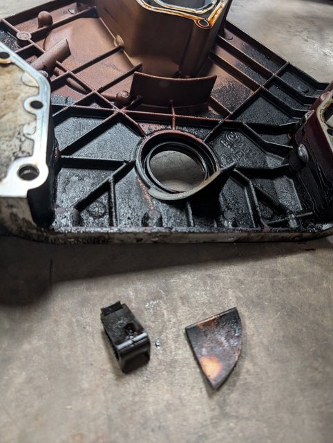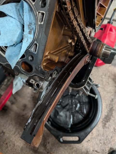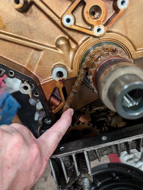 I set up with the crank hub holder and a giant breaker bar, but then thought I’d give my impact a try first. I wasn’t expecting it to work, but was surprised when it did. A few seconds of hammering with it and the bolt spun off. After that, the hub slipped right off. ![]() ![]() The cover looked good, but I think the impact broke an internal flange off of the inside of the lower cover. The chunk of aluminum was laying in the oil pan, but didn’t look chewed up at all, like I think it would if it had been down there with the motor running. Not a big loss since I’m planning on using the non water cooled alternator cover from the M60. Just a word to the wise tho if you plan on using a big impact on the crank bolt. ![]() The chunk of plastic is from a chain guide that I also suspect broke under the impact hammering. The guides are very brittle, but looked really good for a motor haveing 150+ k on it when I pulled it. ![]() ![]() The oil pump chain does have a lot of slack in it. I’m not sure what is normal, but this seems like a lot…it touches the block with gentle pressure. ![]() I flipped the motor over and started taking out oil pan bolts but quickly realized that I would need to reposition two of the engine stand bolts, or come up with another solution. The only other place to bolt into is are the starter mount casting, which worries me from a strength perspective. ![]() Finally, I pulled the valley pan off and was surprised to find a fine powder filling the top of the metal cover, until I remembered that mice had nested in my cosmetic/acousti engine cover at one point and chowed all the foam. ![]() One last picture from the door card I replaced with a “new to me” eBay card that is in amazing shape. I had to swap out the silver trim piece on the handle, and the door handle itself as the silver was a different shade from my oe card. Note the beautiful “airbag” plug that was included.