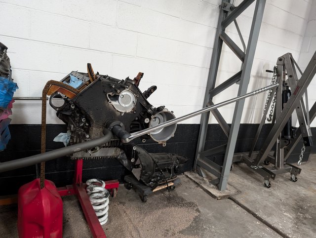 An old saw horse and some wood fit perfectly under the deck of the 4.4 and allowed me to release the two attachment point on the rear engine stand, that were bolted into the oil pan portion of the bell housing flange.