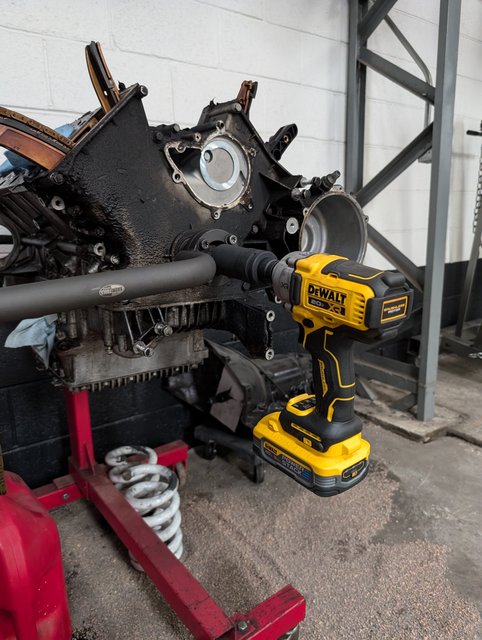 Now that the heads are at the machine shop, I had some time to get down the garage and work on bottom end. I wanted to get the lower timing and oil pan covers off but only got the timing cover done. I had forgotten that two of the engine stand bolts go into the oil pan since part of the bell housing is integrated into it.