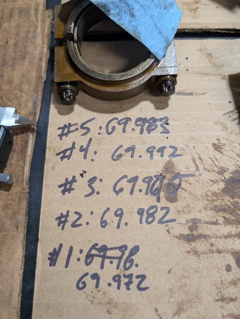 Thanks again for the tipper on the bearing shell decoder ring methodology Bimmerbreaker. My crank looks and measures to within OE specs, so I'm going to order OE size/color main cap bearings. I have 5 new yellow (OE size) block shells that I ordered after using the plastigauge on bearing journal number one. As far as number 5 goes, which doesn't have a color dot, or it somehow wore off (not likely I think, given the other dots looked like new), I'll measure it again as precisely as I can, and order the shell that make sense. Then I'll plastigauge that number 5 journal to make sure its it the correct size. I found a good discussion about BMW bearings (Bimmer World maybe?) that mentioned some builders think that BMW tolerances are too tight, because they want to use the lightest oil weight possible for fuel economy.
