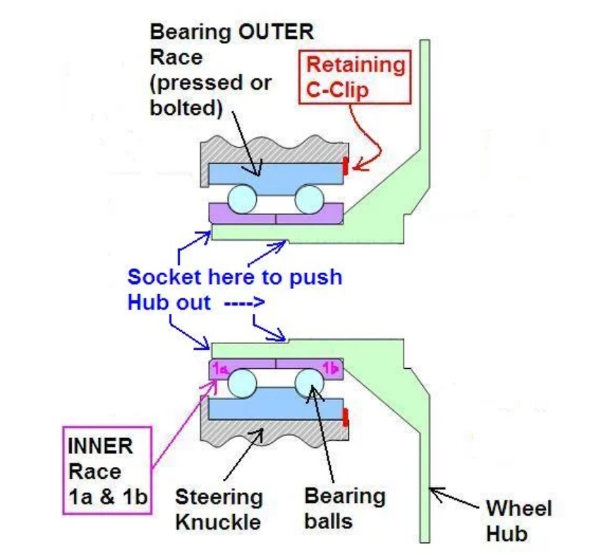 - I sketched a generic photo so you can see OUTER vs INNER race terminology. - When REMOVING hub/bearing (after circlip is removed), you basically push the Hub out, the part called "1b" comes out with the Hub. - The part "1a" is where you apply the force to push the OUTER race out. - During installation: install the new bearing using old bearing but push ONLY on the OUTER race. - Then use appropriate adapters to install the Hub into the INNER race, i.e., force should be applied only to the INNER race during this step bc if ppl use a hammer to pound on the Hub at this stage, the force generated by the hammer goes like this: Hub ---> Inner Race ---> Bearing Balls ---> OUTER race: a big no-no. ---