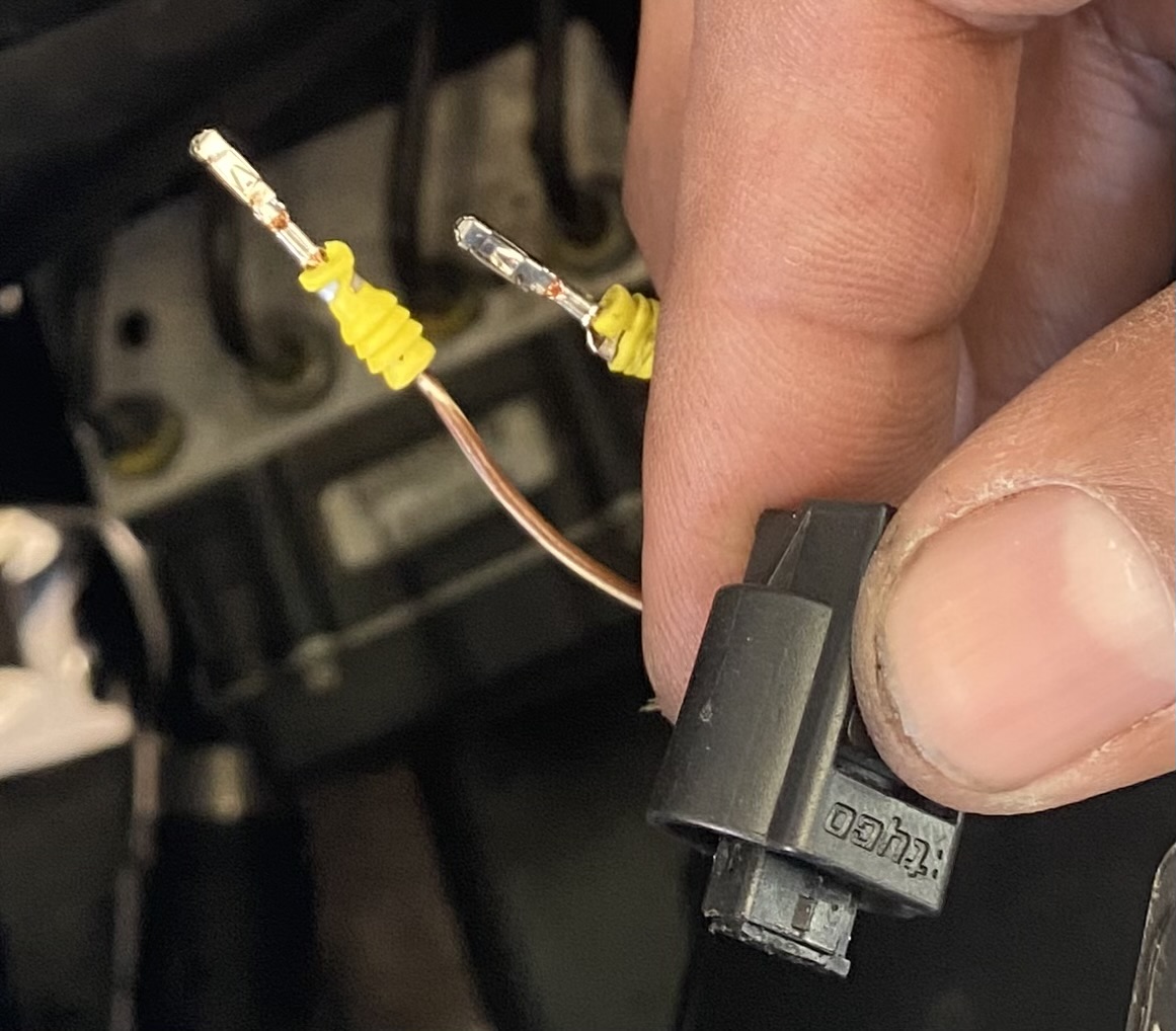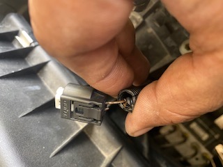 The white clip has to come out carefully. Using a small screwdriver, the pins were released. Another screwdriver pushed the pins out. The broken wire was repaired. Pins were reinserted without issue. Tape and wire loom now protect the harness. Harbor Freight tube holders were installed. The transmission lines no longer teeter the oil cooler. After a test drive, no coolant leaks were seen at the oil cooler. Small holes were drilled into the belly pan low points. A leak will be visible quicker.