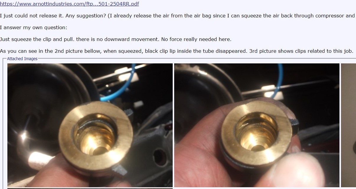 I don't have air suspension so I've not seen these exact couplings before - just going off existing engineering knowledge and experience - and internet images! ![]() What is curious is how the mechanic messed this up. I'm guessing the hose was not able to be removed as they didn't understand how to release the retention mechanism - a guess backed up by their failure to install the new parts correctly also. ![]()