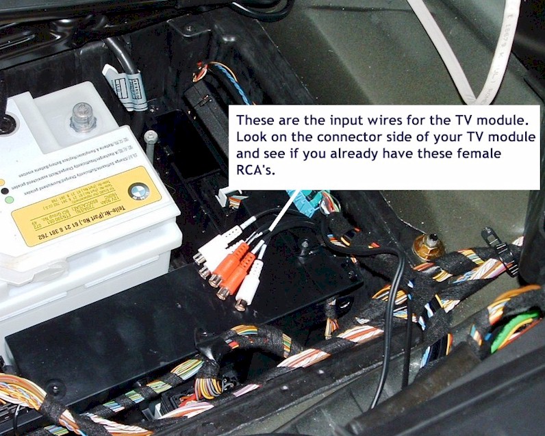 See the pic. This is in the trunk area by the battery. You may need to pull out the electronics tray to look for these wires on the side of the TV module. You'll have to pull it out anyway to connect the camera. |