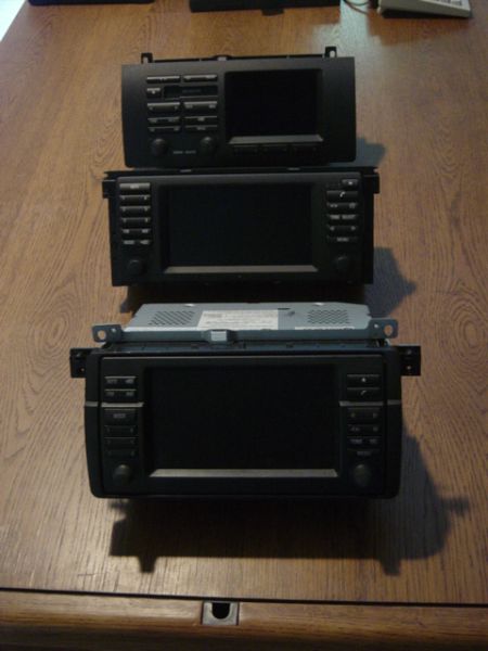Below is a picture, from front to back, of an e46 screen, an X5 16:9 screen, and an X5 4:3 screen. I had all three at the same time when I was doing the 4:3 to 16:9 conversion. Trust me, the e46 screen would not integrate very well in an X5.