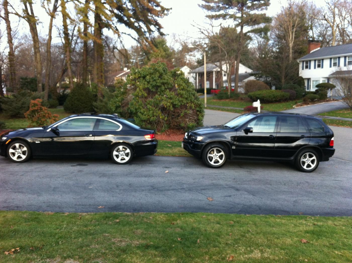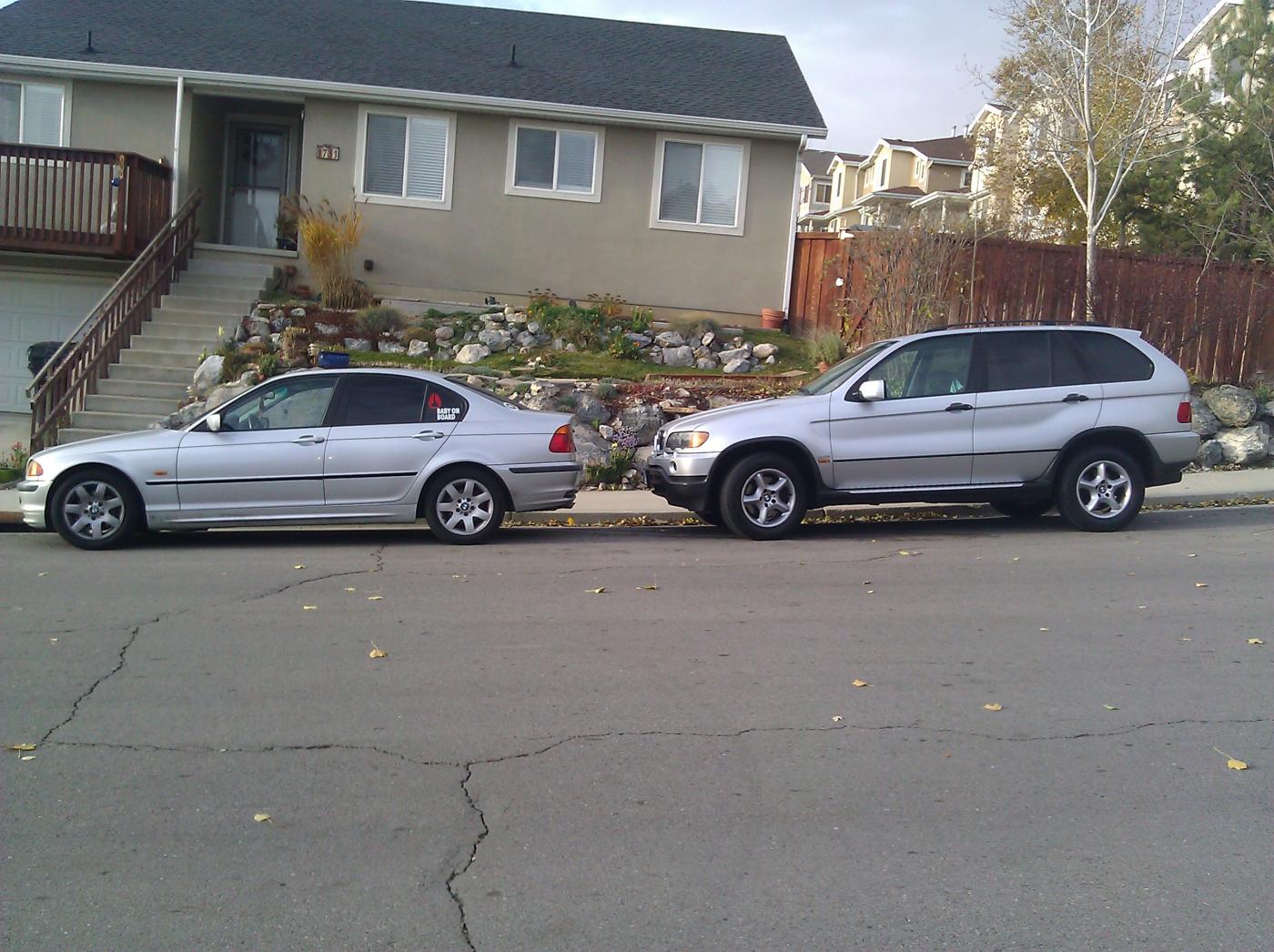 My 1999 323i (215k runs like a champ) which i've owned for almost 6 years and 100,000 miles used to have 25% tint on the front which made it look way sportier but had to take it off to register the car, and my 2001 x5 3.0 purchased in november with 99k miles @ 9300$.. runs great but has a few minor things which someone as ocd as me would have to fix. not pictured are the changes i've made since purchase, changed the side markers to black and changed all the emblems to black/white and also got all weather bmw mats...