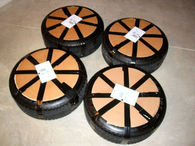 i use a round soft piece of carpet anti-slip padding on the face of the rim... 2 pieces of round cardboard (via tirerack)... 1 piece of cardboard on the backside... and heavy duty duct tape securing the rims & tires. i armor all the sidewalls front & back so the duct tape doesn't adhere to the sidewalls and leave adhesive residue behind. shipped via ups ground. weight 65 lbs each. (18" 3.0 sport rims w/ snows). ![]()
