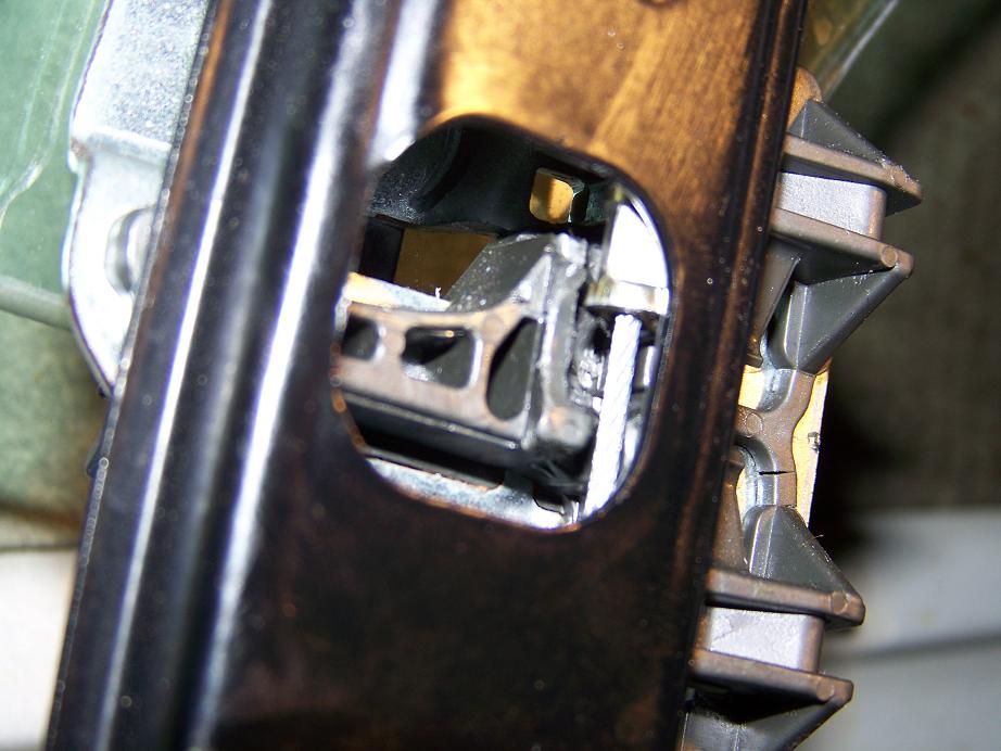 Here are the pictures of the broken clip with the cable out of the track. The loud popping noise is from the nut on the cable. As the window is rolled up, the nut hits the opening on the black bracket. This is when the pop sound is heard. Does anyone have a price on this clip? I am going to the dealer next week.