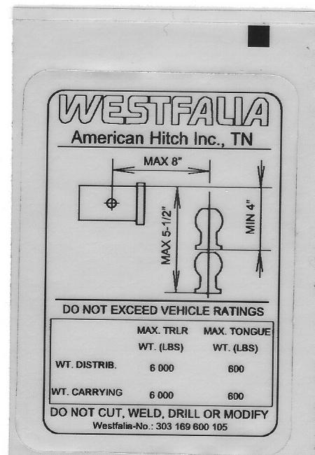 Interestingly, my local U-Haul has a memo from their head office that says they are not allowed to touch an X5. They paid out so many damage claims that they won't go near one now. I only found out because I had the OEM hitch and wiring, and when I rented a trailer they asked about my wiring. When I said that I had the OEM wiring solution they said great, because otherwise we can't help you or rent you a trailer. They were quite willing to talk about their previous experiences. Their modified hitch with the strut running forward was a design modification due to early models bending the X5 rear pan. For a bike carrier, you are pushing the limits of the OEM hitch. It isn't the tongue load that matters, it is the twisting (bending moment) applied by the CoG of the bike. The hitch is designed for a point load at the hitch ball. A carrier twists the hitch, essentially. Static load calculations would suggest that you may get away with a couple of hundred pounds mounted fairly close, but now add in the dynamic loads (going over a speed bump, for example). Dynamic loads can be multiples of static loads. Previously discussed here: http://www.xoutpost.com/bmw-sav-foru...solutions.html and in many other similar posts. Search on 'bending moment', that is how I found this old post. Here is the label that comes with the OEM hitch for maximum tongue weight, and more importantly, intended location of that load. Notice that the hitch is designed for the load to be applied (fore and aft) below the hitch centreline. With a carrier, the load will likely be significantly above the hitch centreline, and thus outside of the design limits of the OEM hitch. Good luck. Jeff
