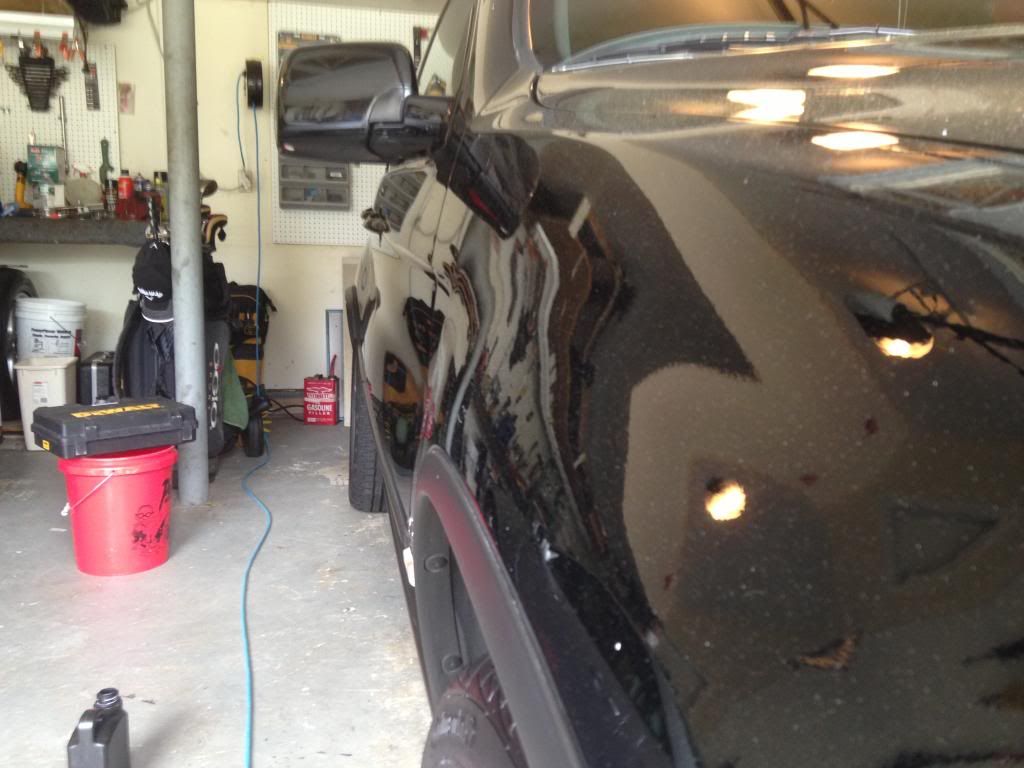 Exterior: Wheels Prepped and cleaned with Sonax Full FX and Adams APC Body washed and dried Paint prepped with Aquartz Iron Cut. Lots of Contaminantes on the paint. Rinsed then Clayed Swirls were everywhere. So I used Mezerna SI for correction. Then hit it with Mezerna SF to blend everything in. Applied Aquartz Titanium Then 6 coats of GlanzWax Wheels pulled and sprayed with Wolfs Decon Gel Old adhesive from wheel weights removed with 3m Adhesive remover. Clayed all wheels 2 coats of wax on each wheel Wheel wells cleaned with Adams APC and dressed with Adams Undercarriage Spray Interior: Vacummed and rubber mats washed with Adams APC Leather cleaned with Z1 Deep Plastic Cleaner Applied Zymol Conditioner to Leather. I am thoroughly tired! haha. But I think it came out great. First time I used my Porter DA on it and my shoulder doesn't hurt. So the results were great and hitting the paint with the light, all swirls are GONE! Reading Phil's page (Detailersdomain) He found out if you used the glanzwax on Metallic paint, it makes the metal flakes pop. Using it in multiple coats, gives the paint this killer WET look and I agree. After the 6th coat though, I noticed it didn't look any different than after the fifth, so I stopped. Hope you guys like. Enjoy the pics. ![]() ![]() ![]() ![]() ![]() ![]() ![]() ![]() ![]()