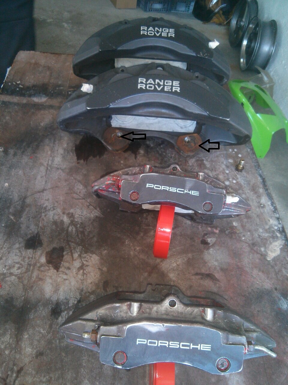 i will tray to explain you with the photo what i do for fix this calippers to my x5. the front is: RANGE ROVER SPORT 2014 SUPERCHARGED FRONT 6POT BREMBO the rear is: Porsche Brembo 4 Pot Brake Calipers 996 or 986 (is the same) The rear calipers is not a problem you must make the adapters for x5(because is the universal calipers) For the front : The bushing Insert needs to be removed from the original calipers (photo#1,2). The Assembly needs to be adjusted with new holes being milled out to size on the BMW(sorry no photo). Using the previous Bushing Insert a new Bushing needs to be made on the Lathe Machine(photo#3) & installed on the Callipers. |