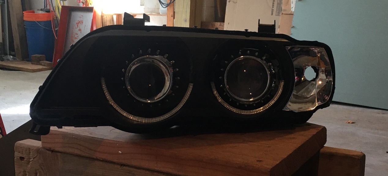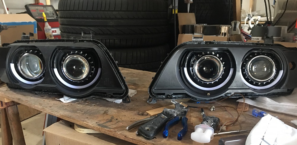 Then on to the headlights. I put the wiring for the new AE rings in and put both units on the car. Polished them best I could with a Turtle wax kit (which is pretty good) but ultimately I will sand them with P600 or P800 and hit them with Eastwood 2k Clear. Here is a picture. I really like how they came out with the reflectors painted black. Now just need to connect the 12V to the AE relais harness and find a lighting wiring inside the cabin to trigger it with the parking lights.