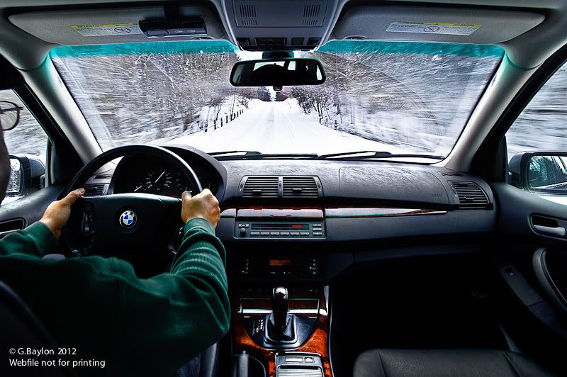 Camera is on a tripod in the back seat stabilized by two 5-pound dumbbell plates. Camera: D3 Lens: Nikon 17-24mm f2.8 set at 17mm Remote: pair of pocket wizards. ISO 200 f/8 at 1/6 sec. X5 was only traveling at 40kph (25mph?) well within the speed limit. the speedometer needle was photoshoped to read 160kph (100mph). |