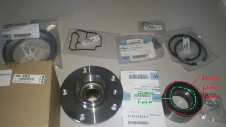 . Make sure you press the new wheel bearing on the correct ring. I destroyed the new bearing when I pressed it in and didn't noticed it until everything was put together and my X5 front wheels started shaking. Good Luck