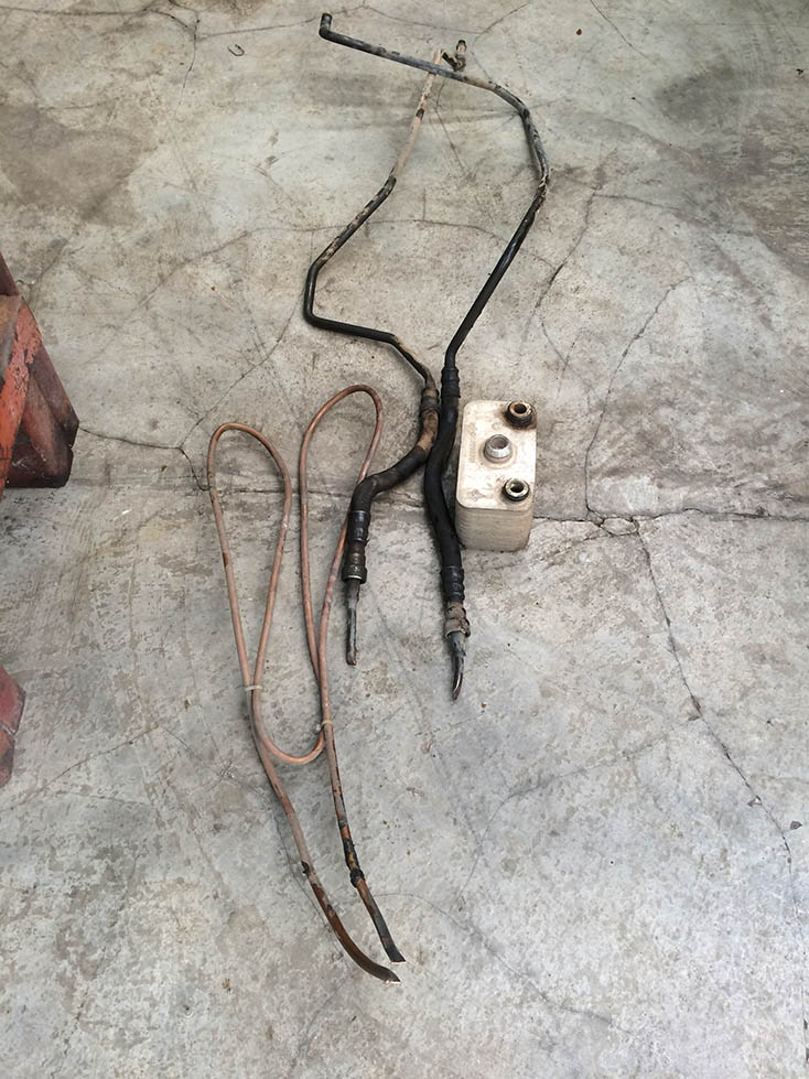- the heat exchanger and the lines and connectors were cut out (see pictures comparing a good one) for the ATF was removed as I posted early in this thread. FIXED! However this triggered another problem, now I get a slam sometimes from a hill stop&go transition. The engine revs but there is no movement, then the car engages but really hard.