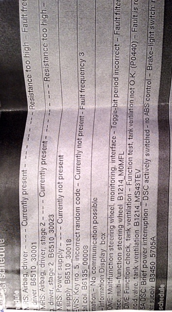 The bigger issue (as posted in my previous thread) are the brake lights are stuck on and I have the trifecta (ABS/DSC/Brake) lights on the dash. I've replaced the brake light switch but that didn't fix the problem. Below are the 4 pages of codes that showed up, I think I need a new LCM and a new ABS module but the local Indy shop has told me it is not worth fixing. I hope you guys can read the codes and offer some insight. Sorry 2 pages loaded in the thread but the other 2 pages are jpegs and have to be opened. Thanks a lot, Mike |