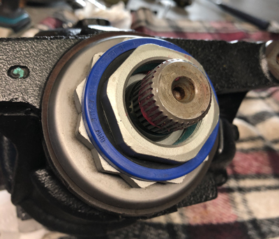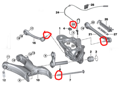 A. the diff weighs about 60 pounds B. The bolt that holds the driveshaft onto the diff is 50mm in diameter and is glued on. I'd guess it takes around 200ft/lbs of torque to turn it and it never gets easier until it is off! If you think you are up for the challenge here's what you need to do. Basically: Raise the car. Gain enough play in the axles to pull the axles out the side of the diff. Separate the driveshaft from the diff Remove diff reverse process to install YOU MUST REPLACE THE DRIVE SHAFT NUT. BMW part number 26117567770 1. Break the lug nuts loose on both rear wheels Get your torque wrench out and put it on the drivers seat (Old school way of making sure you don't forget to tighten them). 2. GET THE CAR UP ON JACK STANDS Most commonly done by jacking up the rear by the differential. Just double check that the housing isn't cracked from the failure. 3. Remove both rear wheels Mostly just to give you some extra room. 4. Deflate the air springs Technically you only need to do one side but releasing the other will raise the suspension up giving you some extra room. Two choices. A. In INPA it's under Chassis >> 1-axle Air Suspension (the lower one is rear). F6 / Activate F2 Actuators Then hit F1, F2, and F3 and you'll hear the air releasing. B. On the passenger side of the car, under the car below the front door, remove that long plastic cover. Behind it is the valve block with the red and blue air lines going into it from the springs. Loosen the 10mm brass nut on each line until you hear the air coming out. 5. Unhook the left rear bowden cable. This is the cable going to the electronic parking brake actuator. 5a. In the back, in the storage area, grab that red plastic tool. Then remove the cover inside the left rear corner. In the corner there is a silver cable end sticking up. Use the tool to pull this up and you'll feel the it release the latch holding the left and right bowden cables together. 5b. Underneath the car, above the rear swaybar you'll see the actuator module. (Pic1). Remove the plastic collar that holds the cable onto the actuator and pull the cable out. 6. Remove the speed sensor Drivers side, #25 in pic2. Tape it or tuck it somewhere it won't get yanked. 7. Remove the brake caliper Two 7mm hex nuts under a plastic cap on the inside. Zip tie it up so it's out of the way and NOT hanging by the brake line. 8. REMOVE THE ENTIRE DRIVER SIDE AXLE / WHEEL ASSEMBLY Remove the 3 nuts on the ball joints and bolt I circled in pic2. It's going to take some muscle but once you remove bolt 7 in pic2 you can rock the bottom of the assembly out and then to the right to remove the left upper arm, then left to remove the right. The entire assembly now comes right out. 9. REMOVE THE DRIVESHAFT NUT This is BY FAR the hardest part of the entire process. See the 4 pics below for reference. There's a lip on the 16 sided pinion nut that holds it to the diff, and then it threads onto the driveshaft holding the two together. That blue stuff on the threads is not loctite. It is some sort of JB-Weld like epoxy somehow applied in two layers. When you install it the two mix together and locks it in place. The notes in the service manual say that once you start threading it onto the driveshaft you have 5 minutes to torque it to 55 ft/lbs. Keep that in mind and be ready to complete it; - Check you have enough room to turn your giant 50mm wrench, I had to shorten mine 4 inches. - The jaws of your wrench need to be 15mm or thinner. I had to grind mine. After struggling in the tight space a bit I went another route. I used a die grinder to cut the lip off the 16 sided pinion bolt on the diff. I used that same red plastic tool to manually put the car in neutral then cut a bit, rotate crankshaft by hand, cut a bit.... that got me to pic 3 with the diff and driveshaft separated but the nut still on the driveshaft. 10. REMOVE DIFFERENTIAL Support it with a floor jack then remove the 2 bolts in the front and one in the back. Lower the jack a little then it will slide back and to the left until the axle and driveshaft come out and then it's free. 11. FINISH REMOVING DRIVESHAFT NUT Pull the red tool out to put it back in Park, get your 50mm wrench and muscle it, it is standard right hand thread. It's a PAIN IN THE ASS but at least now you have plenty of room 12. INSTALL NEW DIFFERENTIAL Pretty much just the reverse but a few pointers. With the new diff on the jack, slide the driveshaft into the diff first and turn the nut 1/2 turn or so but be careful not to get to the start of the glue. You can then rock it to the drivers side and slide it back to the right and onto the passenger side axle. Then lift up and bolt in place. To re-install the parking brake cable. Pull that cable in the back up about an inch and then clamp it with locking needle nose or something to hold it there. Place the threaded rod at the end of the cable into the actuator and then use the square part to turn it 5 or so turns counterclockwise. Then release the cable and it will be easy to thread the plastic collar back on. 13. DRINK A LOT OF WELL DESERVED BEERS That's all I can think of. If something doesn't make sense let me know and I'll do my best to edit it and make it more clear. Last edited by wsmeyer; 12-24-2017 at 09:35 PM. |
